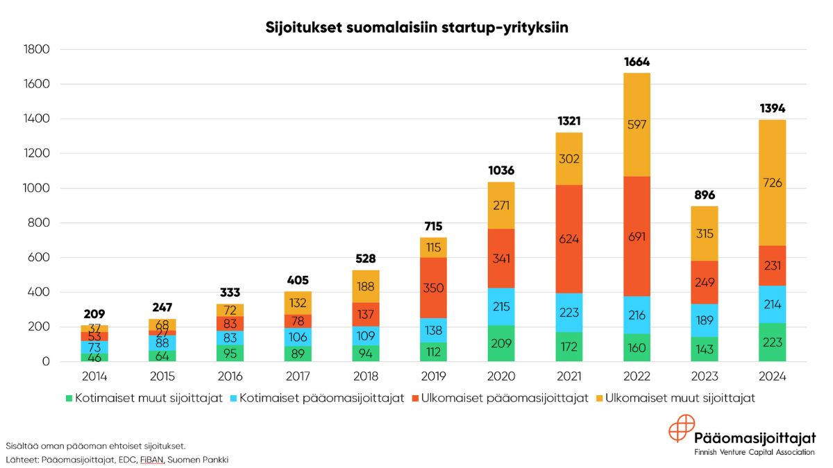 Vuonna 2024 ulkomaiset sijoitukset suomalaisiin startupeihin nousivat peräti 957 miljoonaan euroon. Sijoitukset nousivat 70 prosenttia lähes kaksinkertaistuen edellisvuoden 564 miljoonasta eurosta. Samaan aikaan kotimainen pääoma on keskittynyt lähinnä aikaisen vaiheen yhtiöihin, ja suuret kasvuvaiheen rahoituskierrokset jäävät yhä pitkälti ulkomaisten sijoittajien varaan.