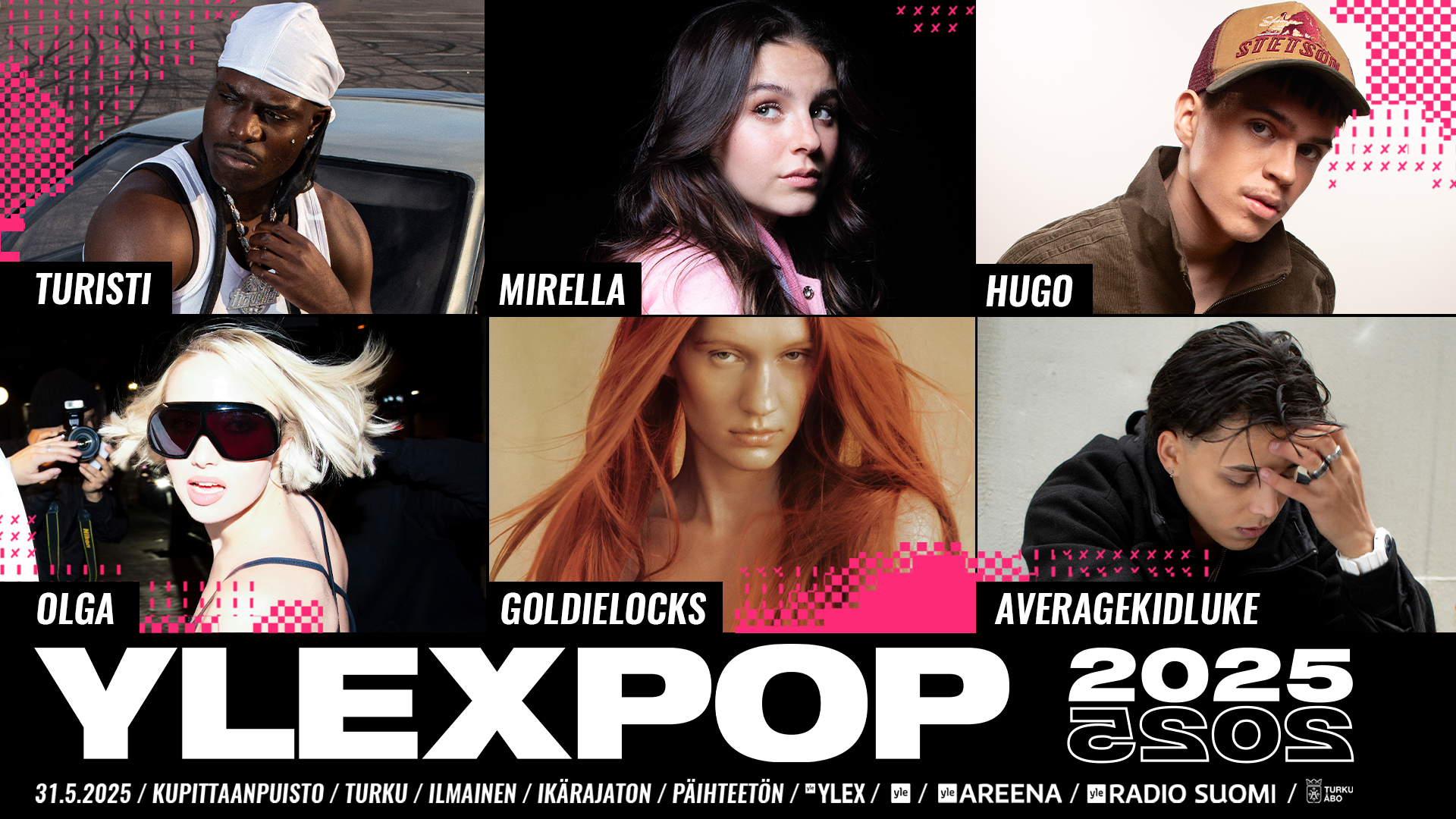 LauantainaYleXPopissa lavalle nousevat popmusiikin tämän hetken suurimmat nimet. He ovat YleX:n vuoden 2025 läpimurtoäänestyksen ykkönen OLGA, Taulut-hitillään suosioon ponkaissut HUGO, UMK:ssa Made of -hitillään loistanut Goldielocks, Emma-palkintoja kahminut Mirella, yksi Suomen kuunnelluimmista artisteista Turisti sekä hiphop-kenttään ryminällä saapunut Averagekidluke.
