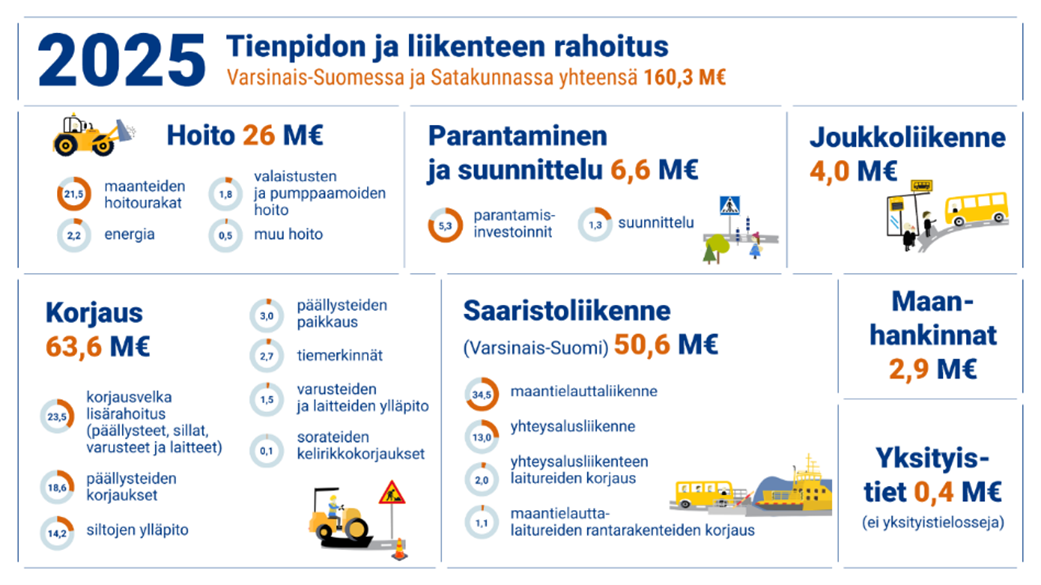 Varsinais-Suomen ELY-keskuksen alueen vuoden 2025 rahoitus on noin 160 miljoonaa euroa. Alueen perusväylänpidon rahoitus on noin 132 milj. euroa sisältäen 23,5 milj. euroa korjausvelan lisärahoitusta.