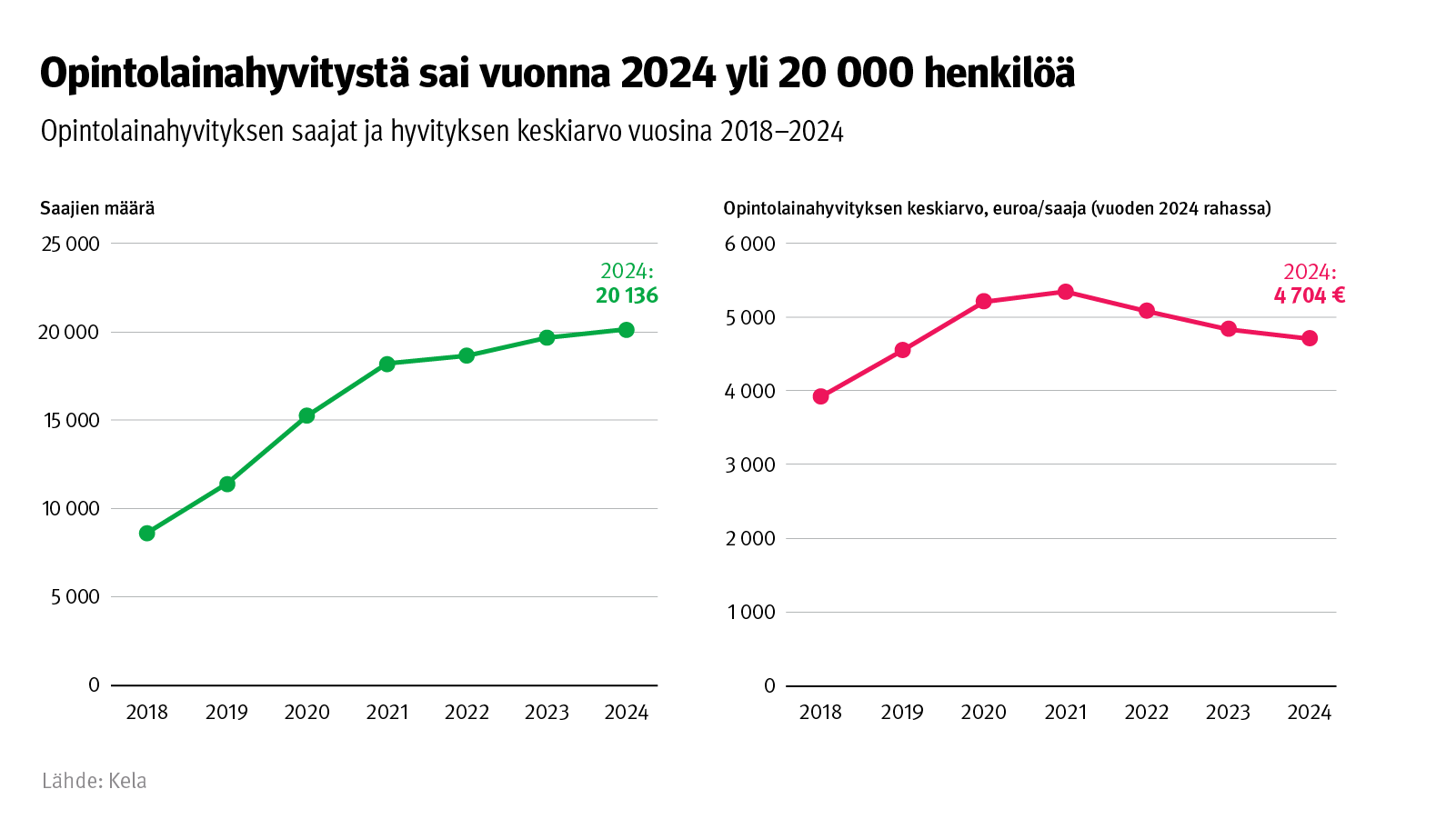 Vuoden 2024 lopussa opintovelallisten keskimääräinen lainasumma oli 12 071 euroa. Opintolainahyvitystä saaneiden määrä nousi viime vuonna yli 20 000 henkilöön.