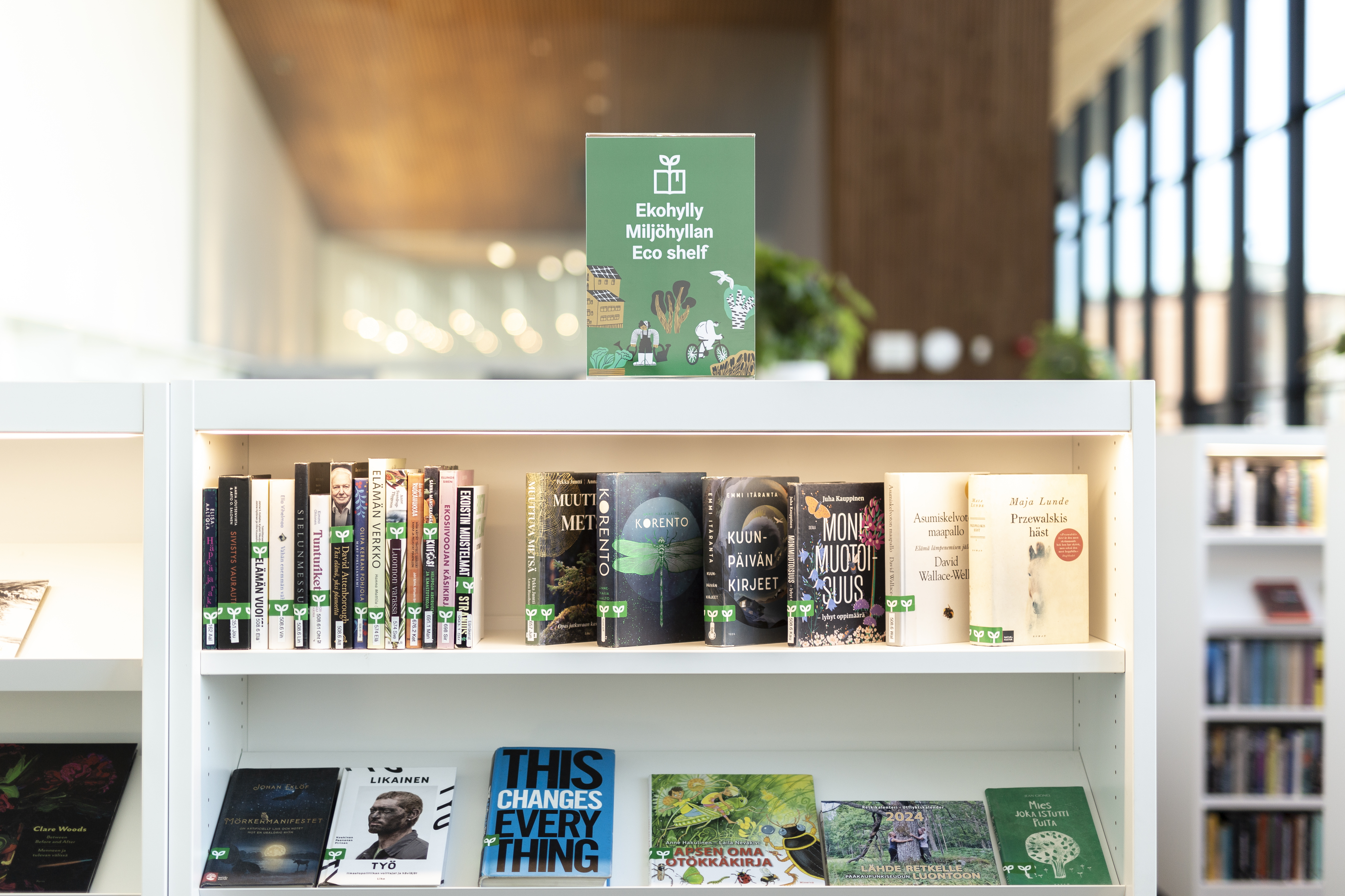 Helsingfors stadsbibliotek har inrättat miljöhyllor på biblioteken med målet att göra information om miljön mer lättillgänglig för stadsborna. Miljöhyllorna har blivit så populära att de ofta har tömts snabbt; i mars var nästan hälften av miljöhyllornas material utlånat. Den här våren ordnar Helsingfors bibliotek för första gången Ekoveckan med evenemang med miljötema.