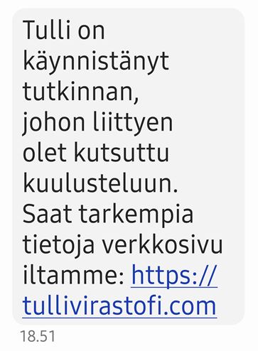Tällä hetkellä liikkeellä on huijausviesti, jossa ”Tulli” kutsuu viestin vastaanottajan kuulusteluun ja ohjaa lukemaan lisätietoja linkin takaa. Viesti ei ole Tullilta.