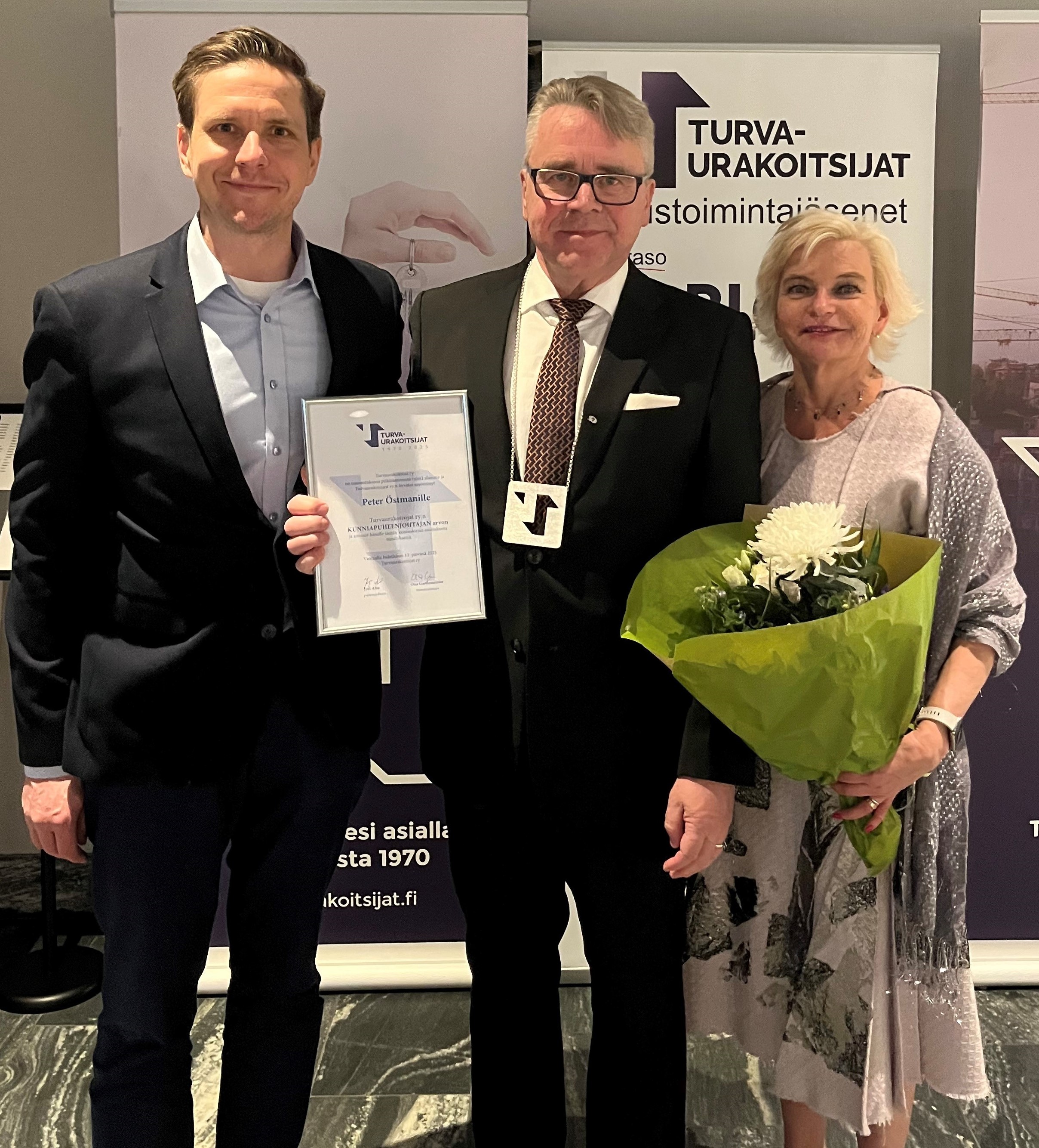 Kunniapuheenjohtaja Peter Östmanin kanssa kuvassa Turvaurakoitsijat ry:n puheenjohtaja Jyri Aho ja tj. Ona Gardemeister