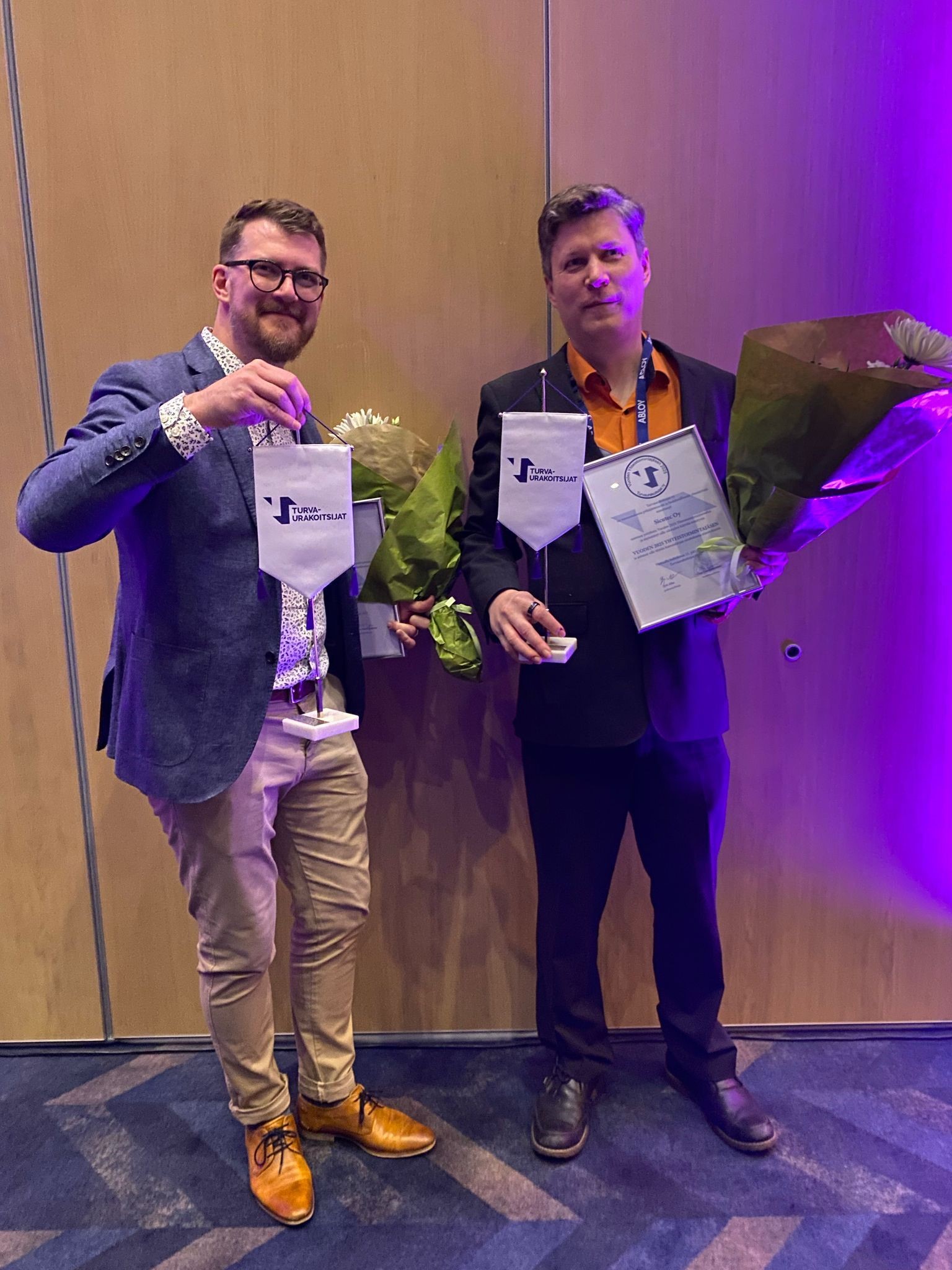 Vuoden 2025 Turvaurakoitsija Kaarinan Lukko Oy:n Roni Aaltonen ja vuoden 2025 Yhteistoimintajäsen Sicutec Oy:n Esa Valtonen