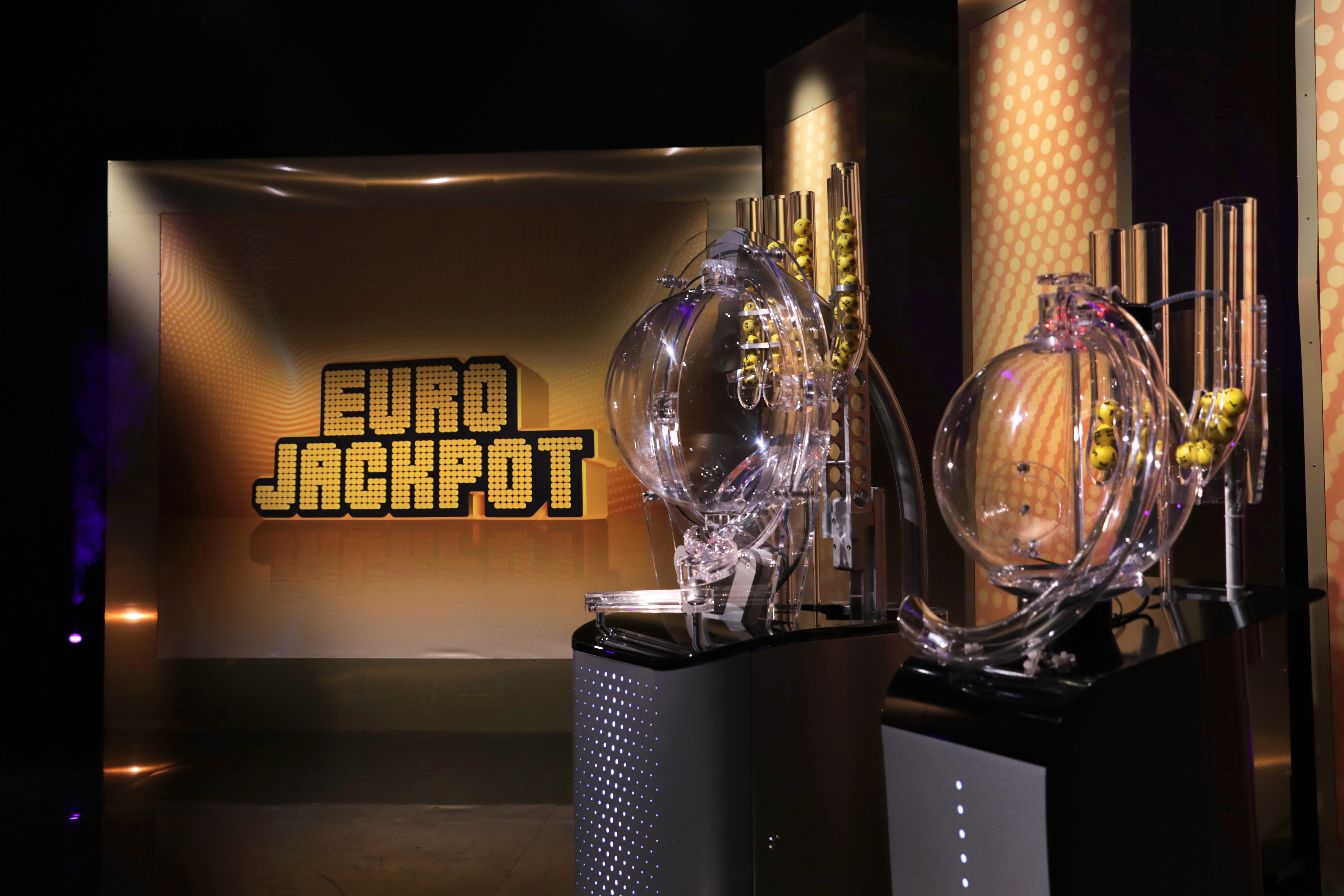 Eurojackpot-studio Helsingissä, sisältäen arvontakoneet ja logon taustalla.