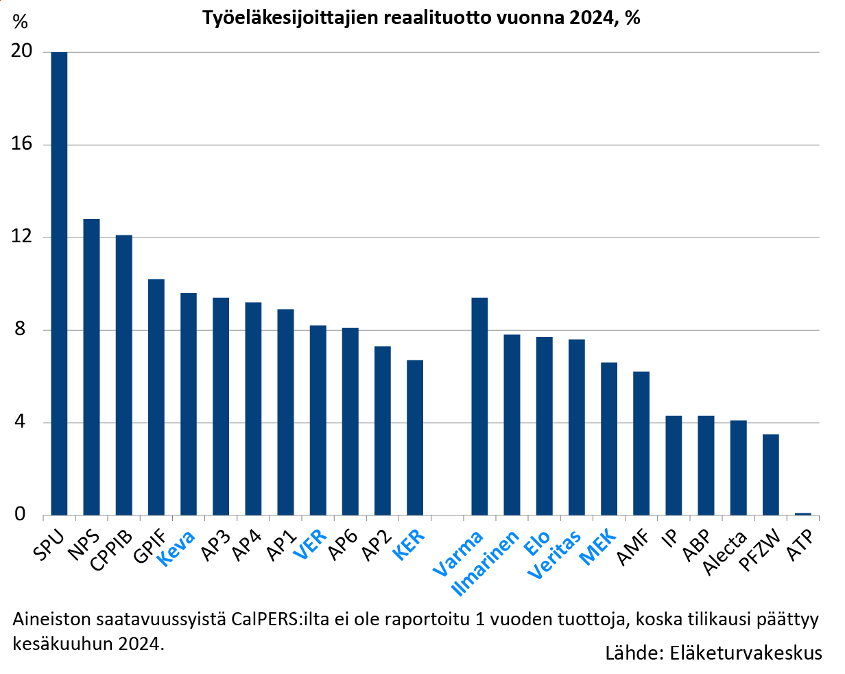 Eläkerahastojen sijoitusvuosi 2024 oli yllättävän hyvä eri puolilla maailmaa. Eläketurvakeskuksen (ETK) tekemässä kansainvälisessä tuottovertailussa keskimääräinen reaalituotto nousi yli pitkän aikavälin lukemien. Suomalaiset eläkerahastot sijoittuivat omassa sarjassaan parhaimpien joukkoon.
