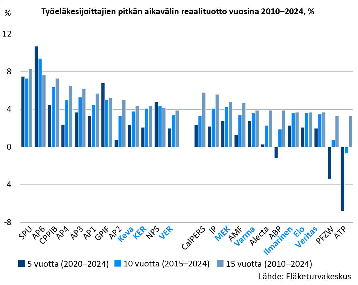 Pitkän aikavälin tarkastelu tasoittaa sijoitustuottojen vuosivaihtelua. Kymmenen vuoden (2015–2024) jaksolla eläkesijoittajien reaalituotto on keskimäärin neljä prosenttia. Viidentoista vuoden ajanjaksolla (2010–2024) keskimääräinen reaalituotto nousee viiteen prosenttiin.