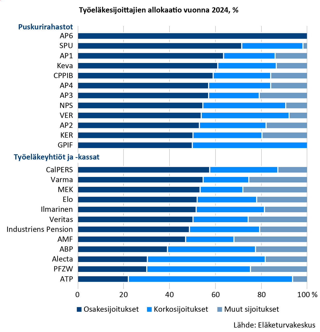 - Suomen työeläkeyhtiöt (Elo, Ilmarinen, Varma, Veritas) ja Merimieseläkekassa (MEK).