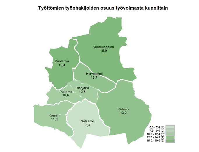 Työttömyysaste oli Kainuussa kuun lopussa 11,6 %, alueista kahdeksanneksi vähiten ja 1,1 prosenttiyksikköä enemmän kuin vuotta aiemmin. Koko maassa työttömyysaste oli 11,8 %, mikä on 1,1 prosenttiyksikköä vuoden takaista enemmän.