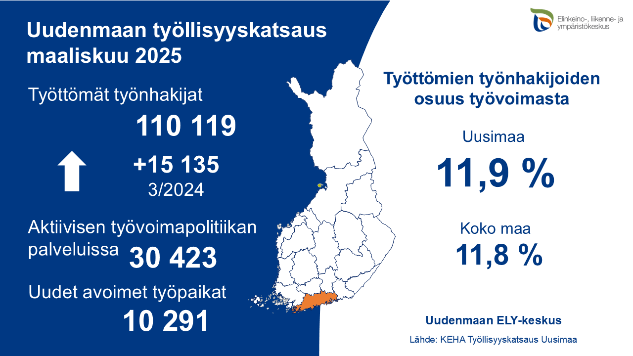 Marraskuussa 2024 alkanut laskeva trendi lomautettujen määrässä jatkui yhä maaliskuussa vuosimuutoksen ollessa -16,7 %. Samalla työttömyys kasvoi Uudellamaalla maakunnista eniten yhdessä Varsinais-Suomen kanssa. Koko maassa työttömiä työnhakijoita oli 12 % enemmän kuin vuosi sitten.