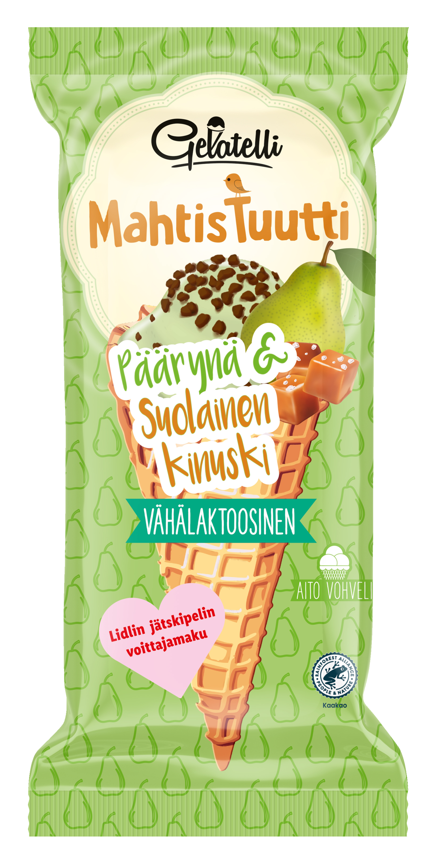 Lidlin jäätelökilpailun voittajatuutti. Aidossa vohvelituutissa on päärynäjäätelöä ja suolainen kinuski -kastiketta ja se on kuorrutettu suolainen kinuski -rakeilla. Tuote on vähälaktoosinen.