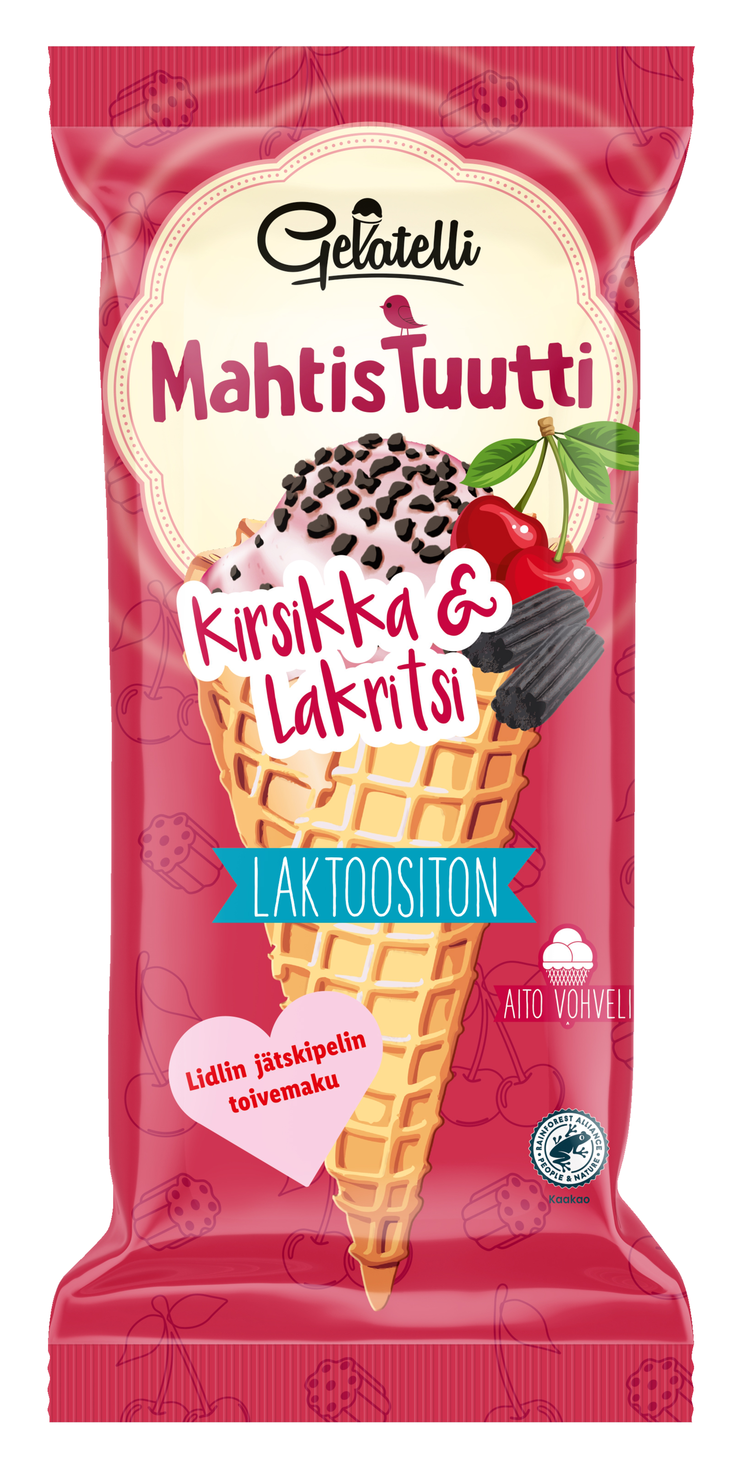 Lidlin jäätelökilpailun toivemaku – kirsikka oli suunnittelukilpailun suosituin maku. Aidossa vohvelituutissa on kirsikkajäätelöä ja lakritsikastiketta ja se on kuorrutettu lakritsirakeilla. Tuote on laktoositon.