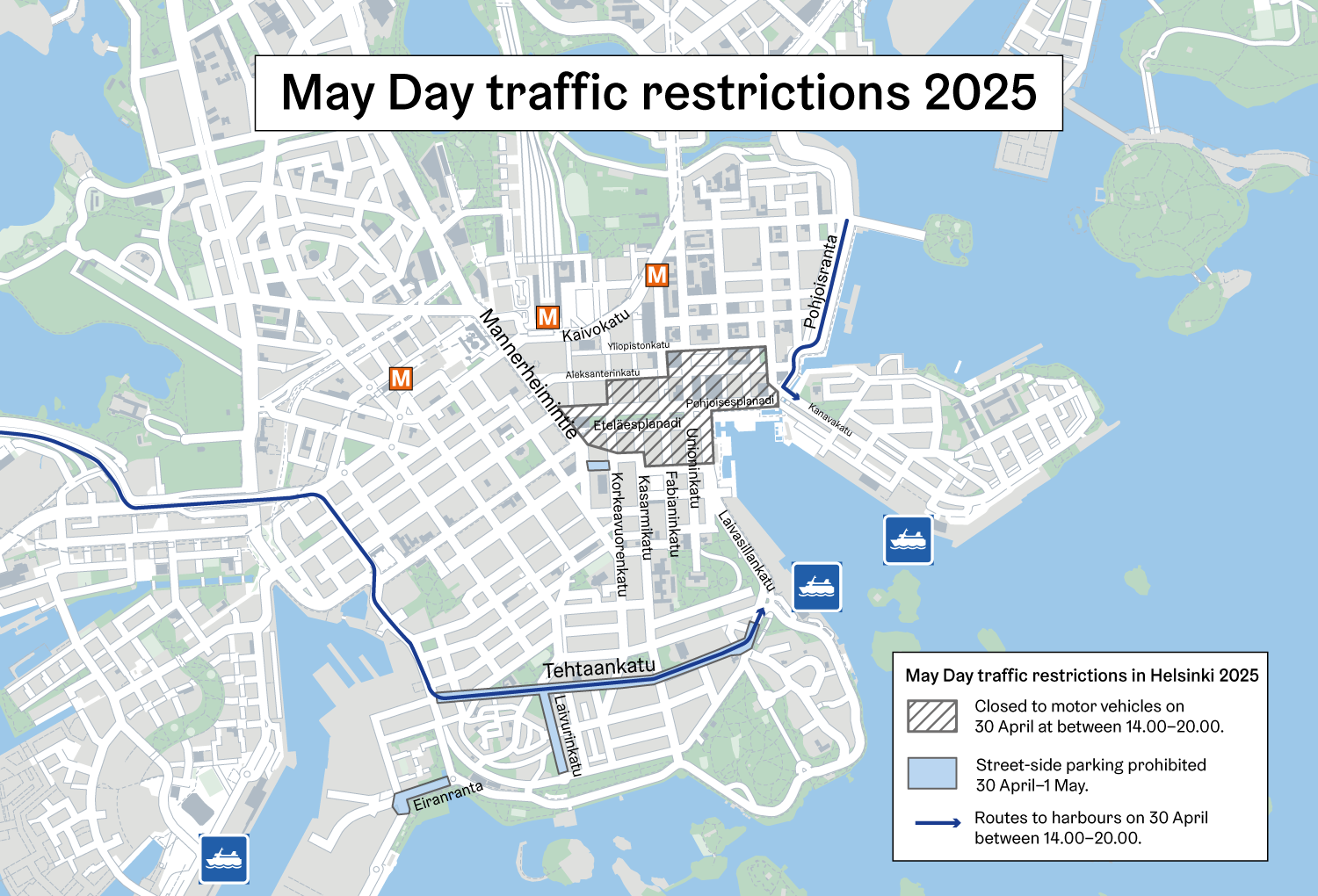 - Parking is prohibited on Tehtaankatu, Eiranranta and Laivurinkatu 30 April–1 May to ensure efficient public transport. This prohibition will also apply to the entirety of Tehtaankatu and will be enforced with posted towing signs. On Laivurinkatu, the parking prohibition will apply between Tehtaankatu and Merikatu. On Eiranranta, the parking prohibition will apply between Telakkakatu and Hernesaarenranta.