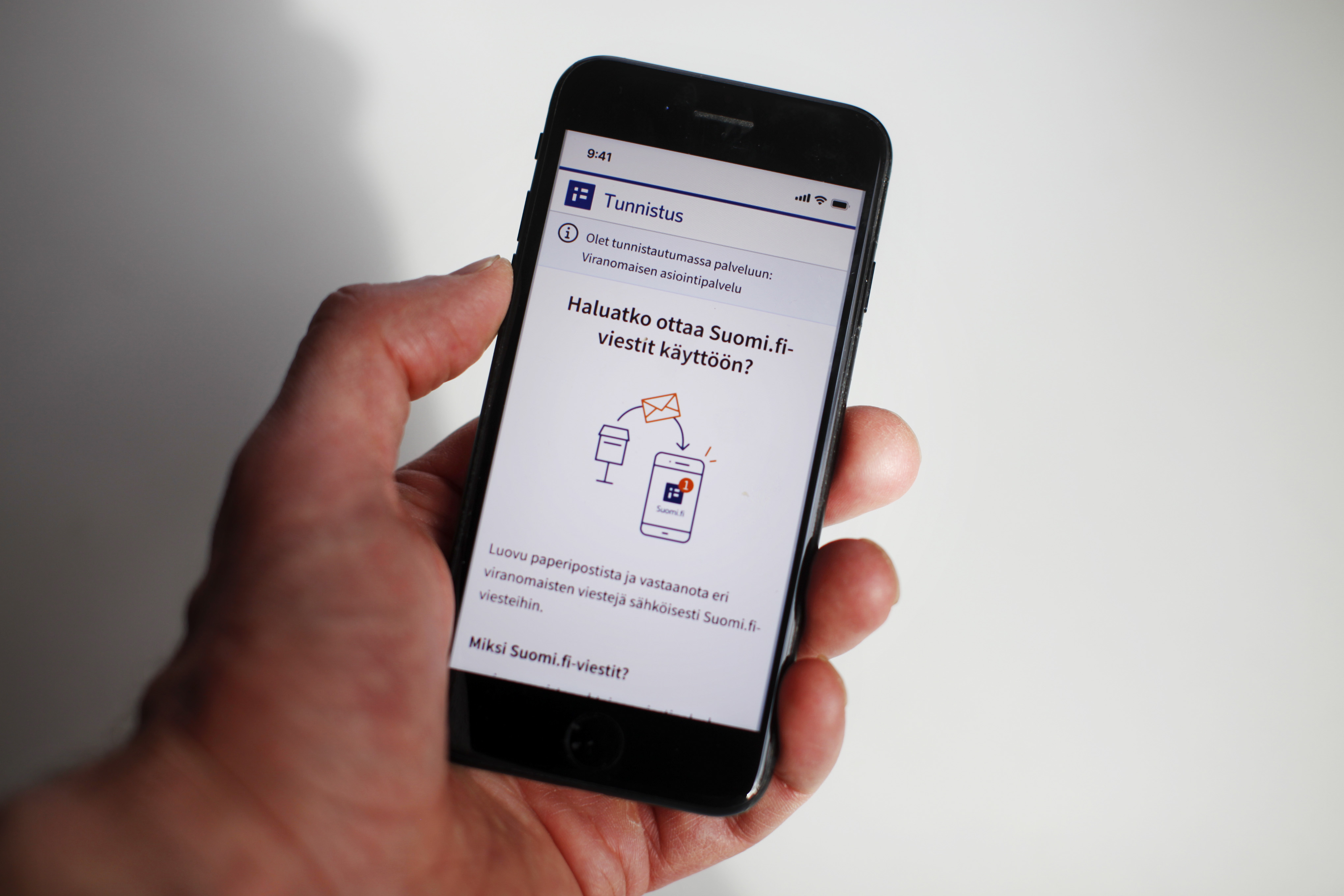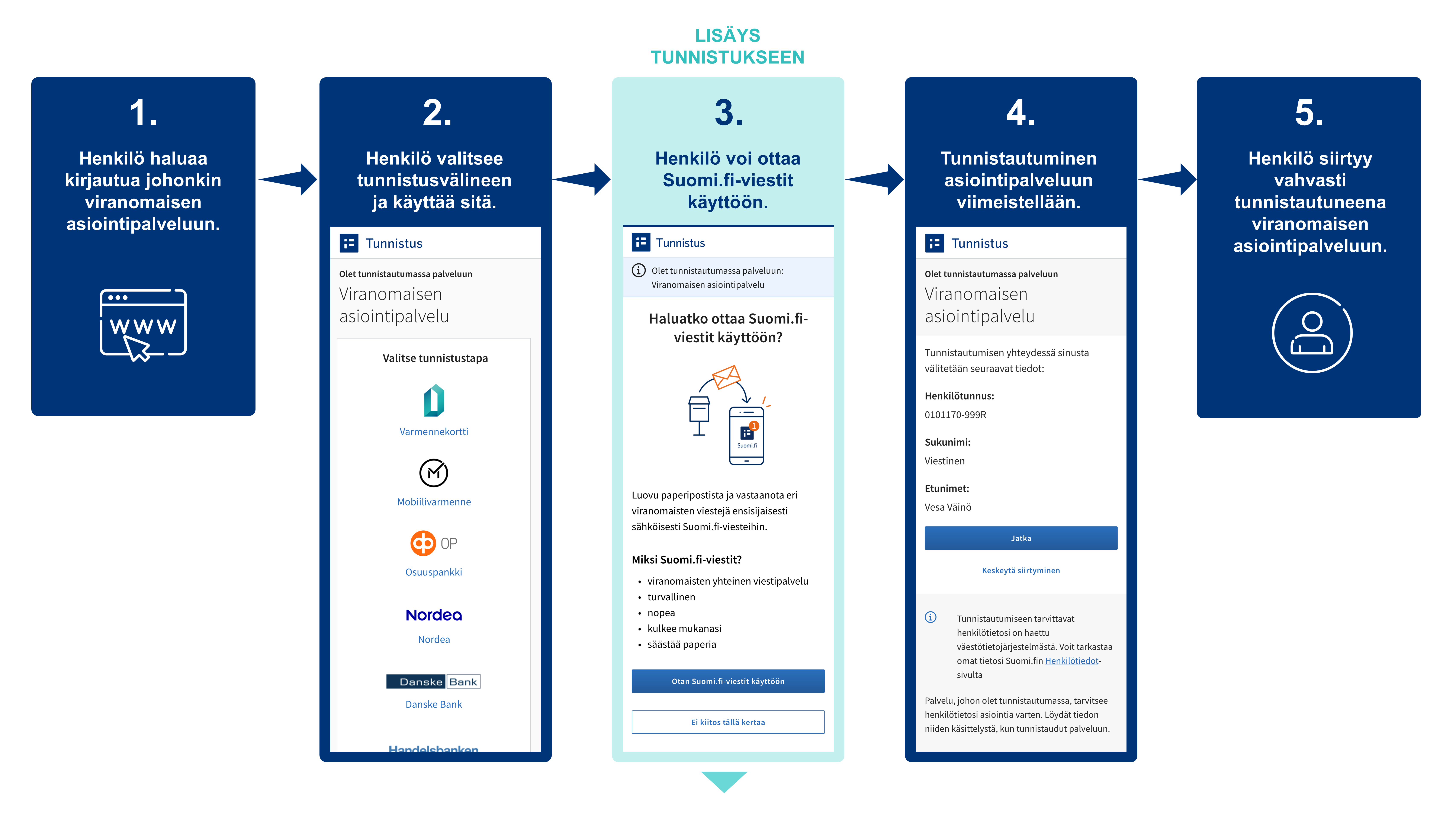- Ehdotus Suomi.fi-viestien käyttöönotosta näkyy aina, kun henkilö tunnistautuu vahvasti julkisen hallinnon asiointipalveluun Suomi.fi-tunnistuksella.