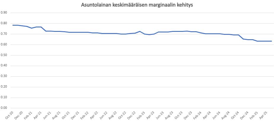 Lainatarjoukset on kysytty 30.4 yhdeksältä pääkaupunkiseudulla toimivalta talletuspankilta. Vertailupankkien keskimarginaali oli 0,64 prosenttia. Uuden asuntolainan keskimääräinen todellinen kokonaiskorko oli toukokuun 2025 alussa 2,77 prosenttia ja huhtikuun alussa 3,00 prosenttia. Kaikki euriborit ovat nyt kahden prosentin tuntumassa. Vertailussa mukana olevien pankkien marginaalit vaihtelivat nyt pankeittain 0,60 – 0,80 prosentin haarukassa. Pankkien primekorot olivat toukokuun alussa 1,50 – 3,00 prosentin välillä pankista riippuen. Lainaesimerkki kuvaa pankin uuden asuntolainan keskimääräistä hintaa pankin normaalilla vakuusarvostuksella.
