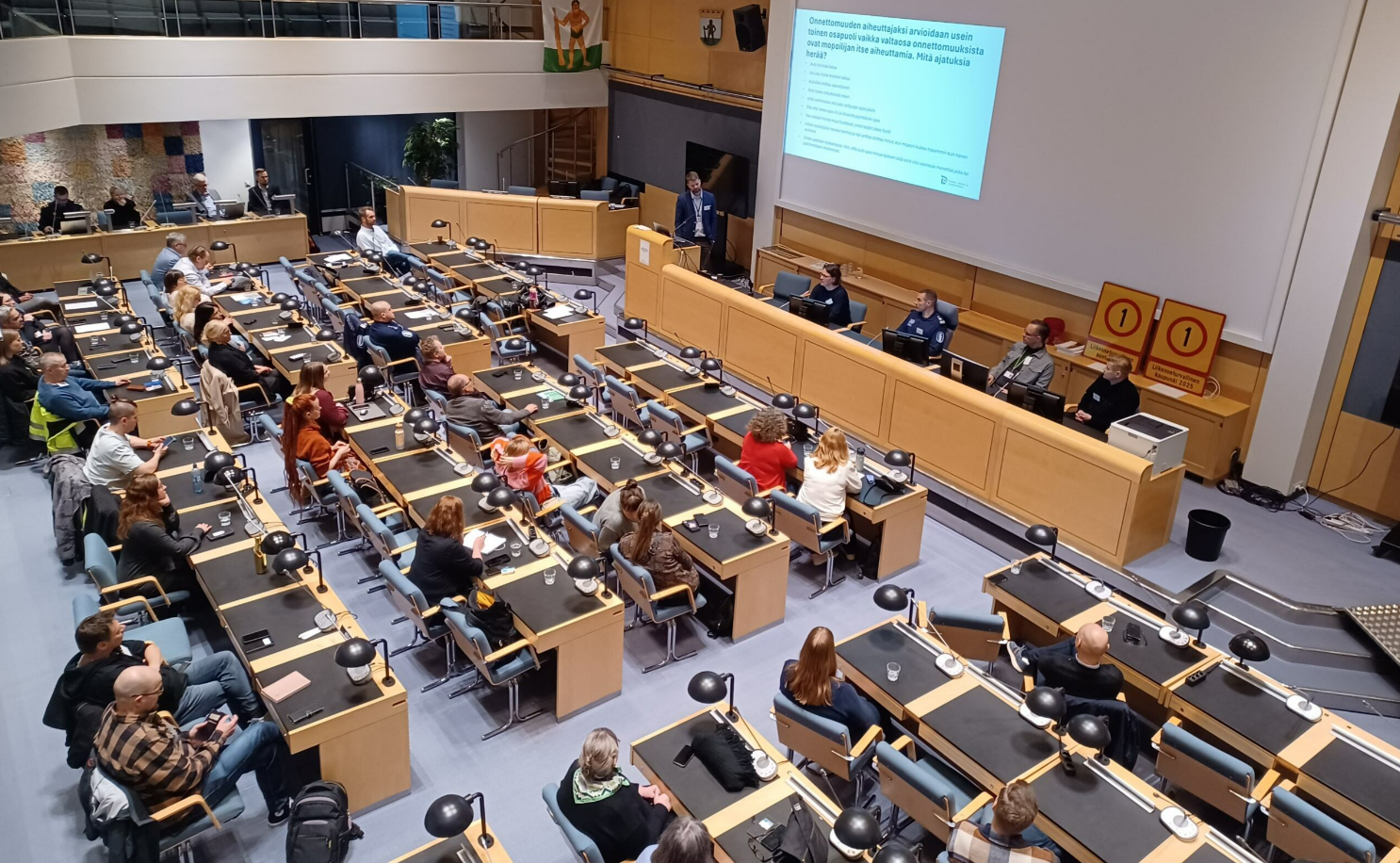 Ihmisiä istuu kaupungintalon kokoushuoneessa seuraten liikenneturvallisuusfoorumin esitystä.