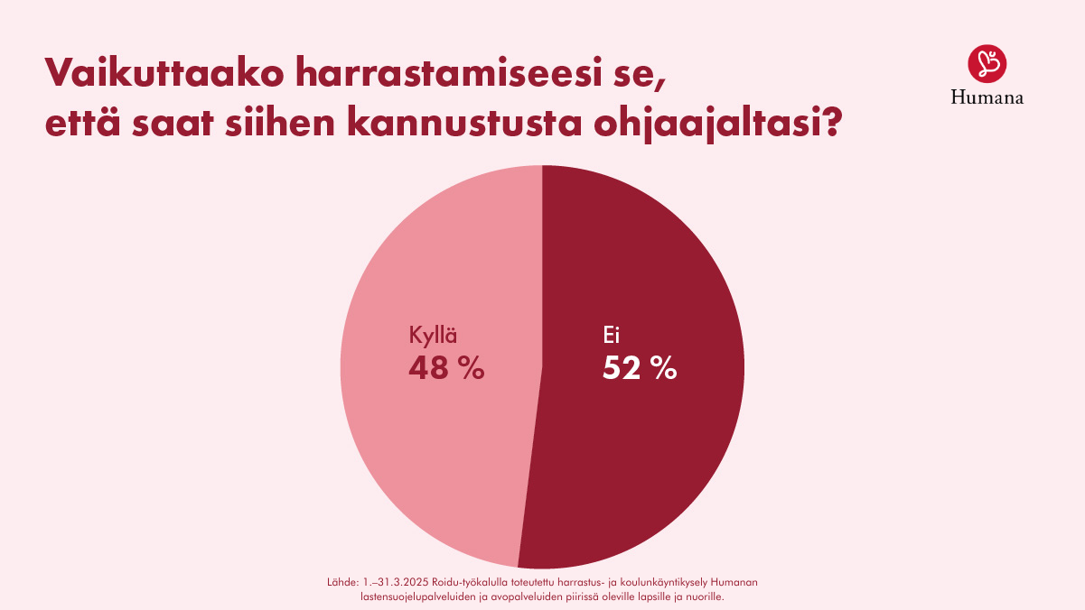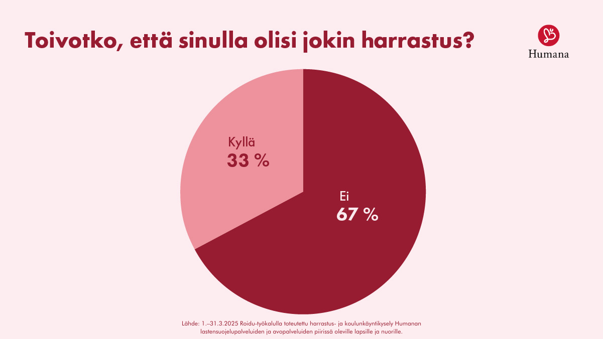 Humana Suomi toteutti 1.–31.3.2025 ensimmäisen, jatkossa vuosittain tehtävän harrastus- ja koulunkäyntikyselyn palveluidensa piirissä oleville lapsille ja nuorille. Kysely ohjaa organisaation toimintaa auttamalla sen ammattilaisia ymmärtämään aiempaa kattavammin nuorten harrastustoiveita. Tämä taas tukee esimerkiksi yhteistyötä paikallisten harrastusseurojen kanssa.