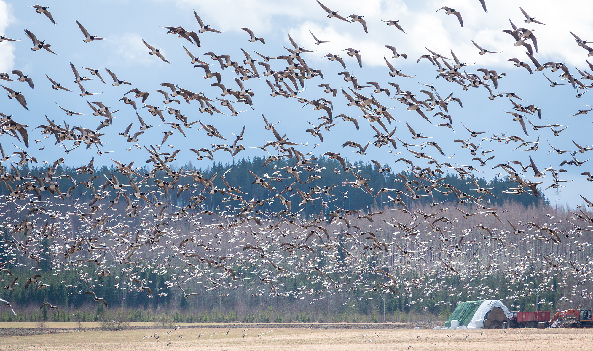 Viimeisen viikon aikana valkoposkihanhien kevätmuutto on edennyt vauhdilla. Kymmeniätuhansia valkoposkihanhia saapui Suomeen kahdessa erillisessä aallossa. Etelä- ja Itä-Suomen pelloilla ruokailee nyt yli 200 000 valkoposkihanhea. Suuresta määrästä huolimatta päämuutto ei ole vielä tapahtunut.