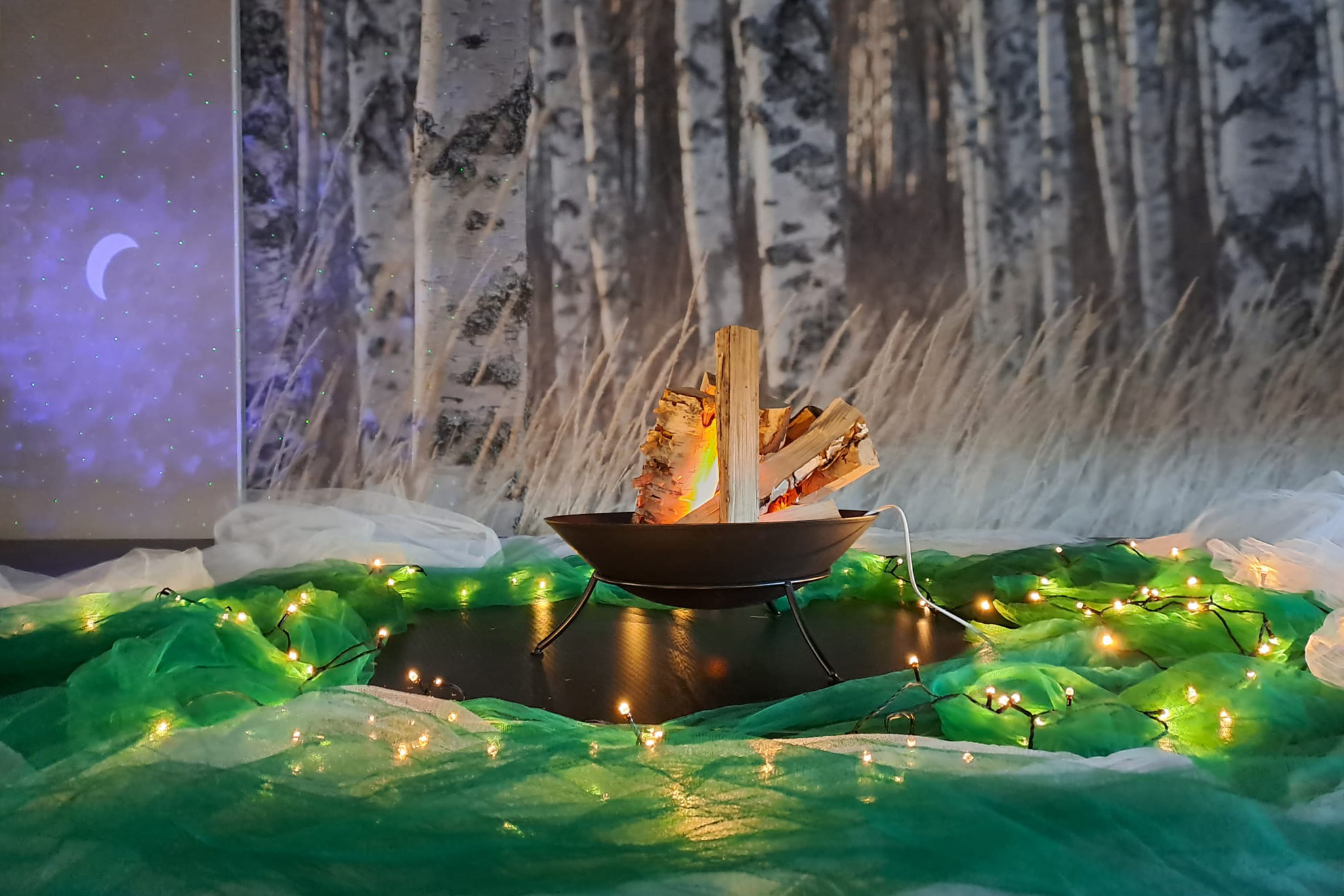 Tampereen ammattikorkeakoulun H-siivessä keräännytty leirinuotion ympärille. Nuotion ympärillä istuu lähes 30 Pirkanmaan hyvinvointialueen (Pirha) lasten, nuorten ja perheiden palveluiden työntekijää.