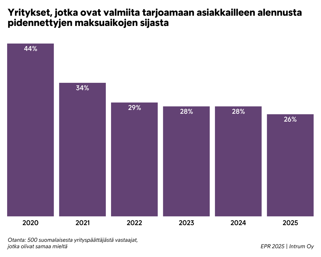 Yritysten halukkuus tarjota alennusta vaihtoehtona pidemmille maksuajoille on laskenut merkittävästi vuodesta 2020.
