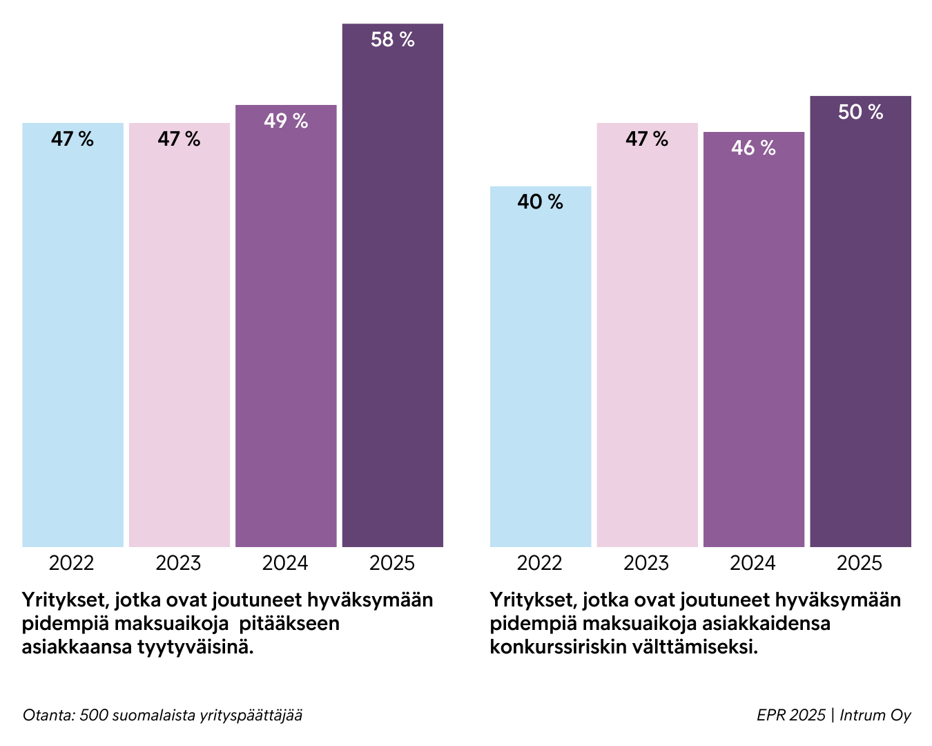 Asenteiden tiukentumisesta huolimatta moni yritys on joutunut tahtomattaan taipumaan heikompiin maksuehtoihin ja pidempiin maksuaikoihin. Sen lisäksi, että palveluista ja tuotteista maksetaan yrityksille aiempaa useammin myöhässä, peräti 70 prosenttia yrityksistä on joutunut alun perinkin hyväksymään kuluneen vuoden aikana pidempiä maksuaikoja kuin pitävät sopivina. Puolet yrityksistä on kuluneen vuoden aikana joutunut hyväksymään pidempiä maksuaikoja kuin olisivat halunneet, jotta heidän asiakkaansa välttävät konkurssiriskin. Vuonna 2022 luku oli vain 40 prosenttia. Vielä useampi (58 prosenttia) on joutunut taipumaan pidempiin maksuaikoihin pitääkseen asiakkaansa tyytyväisinä, mikä on huomattavasti enemmän kuin 47 prosenttia vuonna 2022.