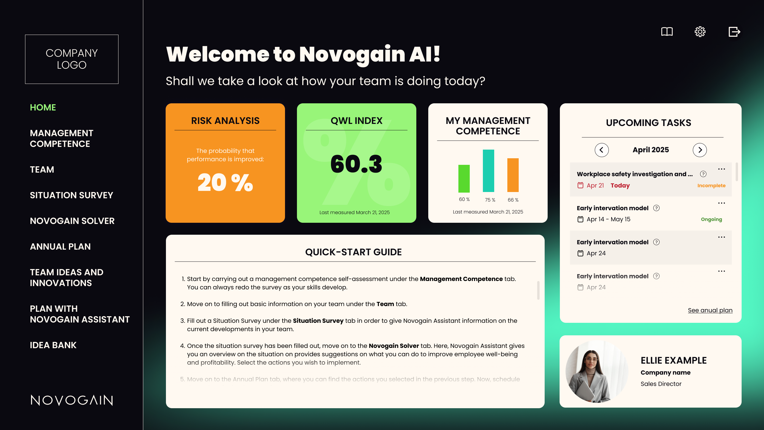 Novogain AI on tuotteistettu helposti käyttöönotettavaksi ratkaisuksi, joka tuo tekoälyn hyödyt suoraan käytännön johtamistyöhön nopeasti ja kustannustehokkaasti.