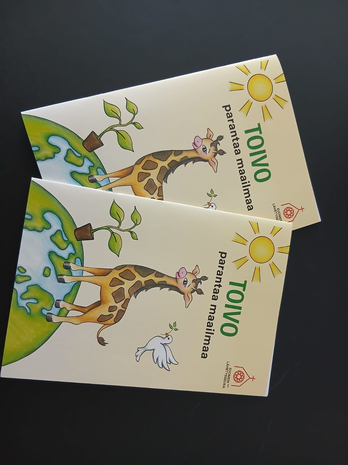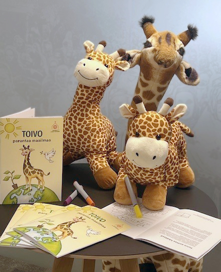 Toivo-kirahvi on Suomen Lähetysseuran monelle tuttu maskotti, joka on nyt päässyt seikkailemaan myös Toivo parantaa maailmaa -värityskirjan sivuille.