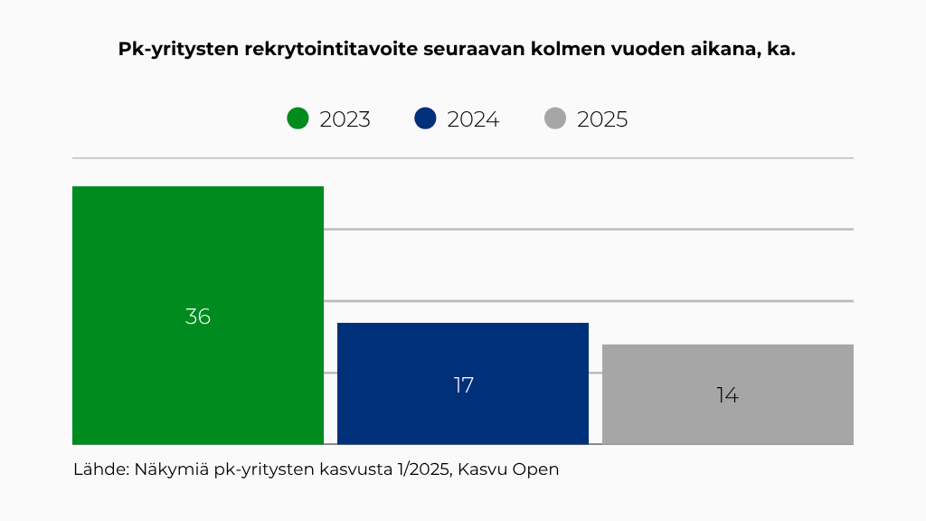 Kasvu Openin julkaisema “Näkymiä pk-yritysten kasvusta” paljastaa muutoksen suomalaisten pk-yritysten rekrytointitavoitteissa. Yritysten keskimääräinen rekrytointitavoite on pienentynyt alle puoleen kahden vuoden takaisesta tarpeesta.