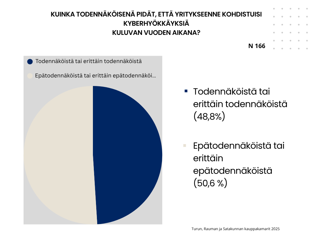 Kyberhyökkäysten todennäköisyyteen uskoo liki puolet vastanneista (48,8 %), joista lähes 10 prosenttia pitää sitä erittäin todennäköisenä. Kyberhyökkäyksiin kertoo varautuneensa noin 75 prosenttia vastanneista. Edelleenkään noin 16 prosenttia ei ole varautunut ollenkaan.
