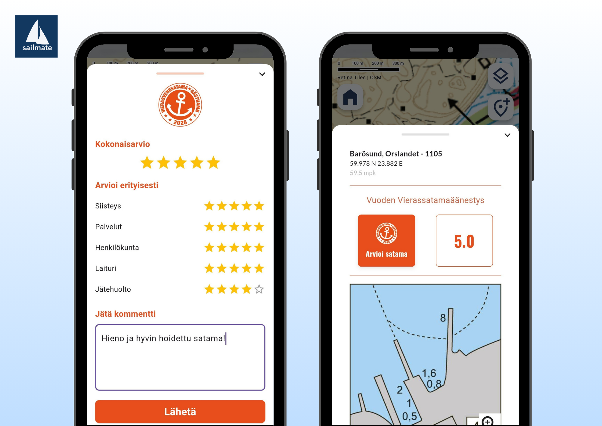 Uudistuksen myötä veneilijät voivat arvioida satamia suoraan mobiililaitteellaan – nopeasti ja vaivattomasti. Käyttäjät antavat arvioita satamien palveluista sekä kokonaisarvosanan, joka on kaikkien nähtävillä. Sovelluksen avulla kerätty palaute tukee satamien kehittämistä ja parantaa veneilijöiden palvelukokemusta. Sailmate on Android- ja iOS-mobiililaitteille ladattava navigoinnin tukisovellus vapaa-ajan veneilijöille. Äänestys on maksuton ja tapahtuu sovelluksen ilmaistasolla. Osallistuminen edellyttää kirjautumista.