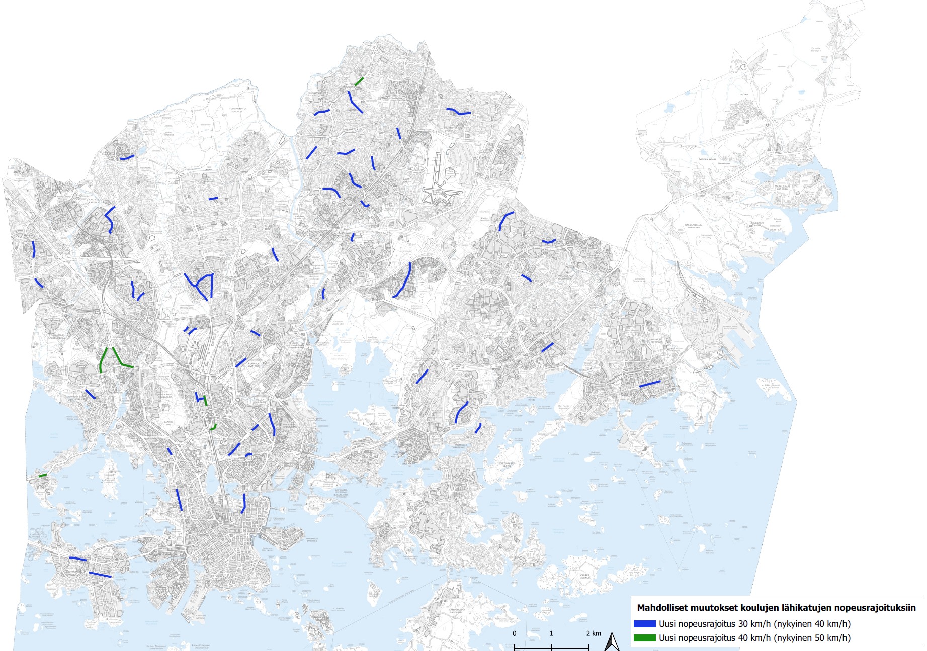 Enligt förslaget skulle det göras ändringar i hastighetsbegränsningarna på cirka 50 gator för att förbättra trafiksäkerheten. Hastighetsbegränsningen ska sänkas i skolans närhet på en kort sträcka av gatan. Annars förblir hastighetsbegränsningen på gatan som den är idag.