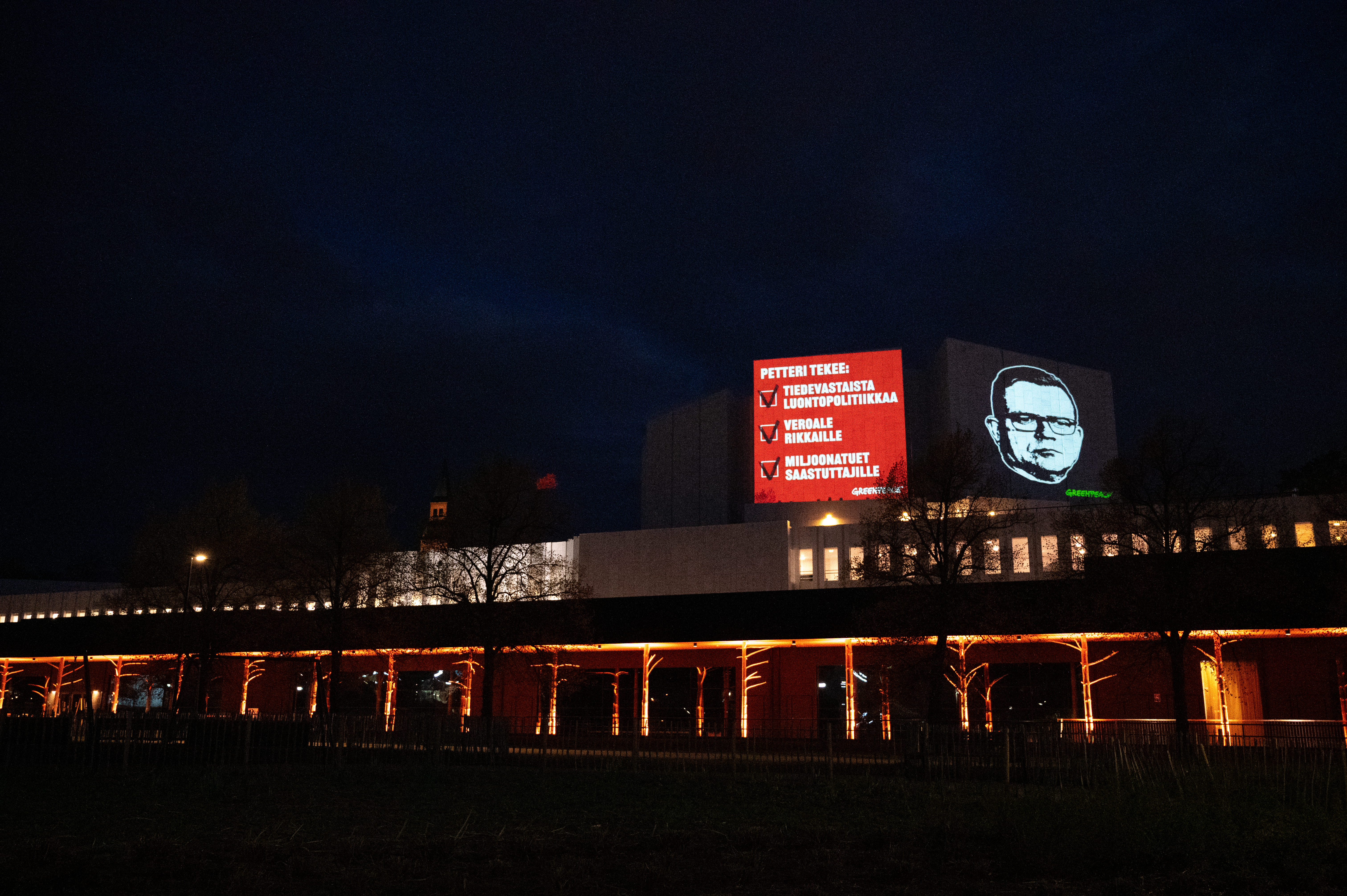 Greenpeacen aktivistit heijastivat sunnuntain ja maanantain välisenä yönä Finlandia-talon seinään jättikokoiset Donald Trumpin, Elon Muskin ja Petteri Orpon päiden kuvat. Projisointi kritisoi Trumpin hallinnon hyökkäystä kansalaisyhteiskuntaa ja sananvapautta kohtaan sekä Suomen hallituksen tiedevastaisuutta ja toimettomuutta luonnonsuojelun sekä ilmastotekojen saralla.