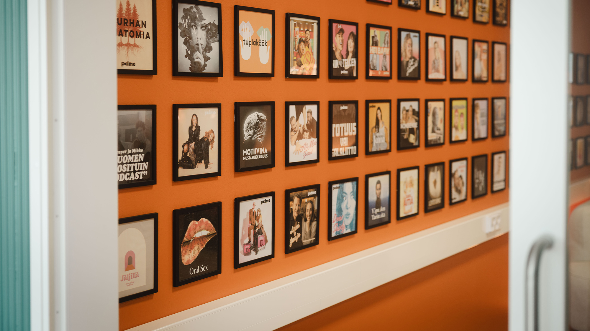 Podmen premium-podcastien kansikuvat koristavat kehystettyinä uusien toimitilojen yksittäistä seinää.