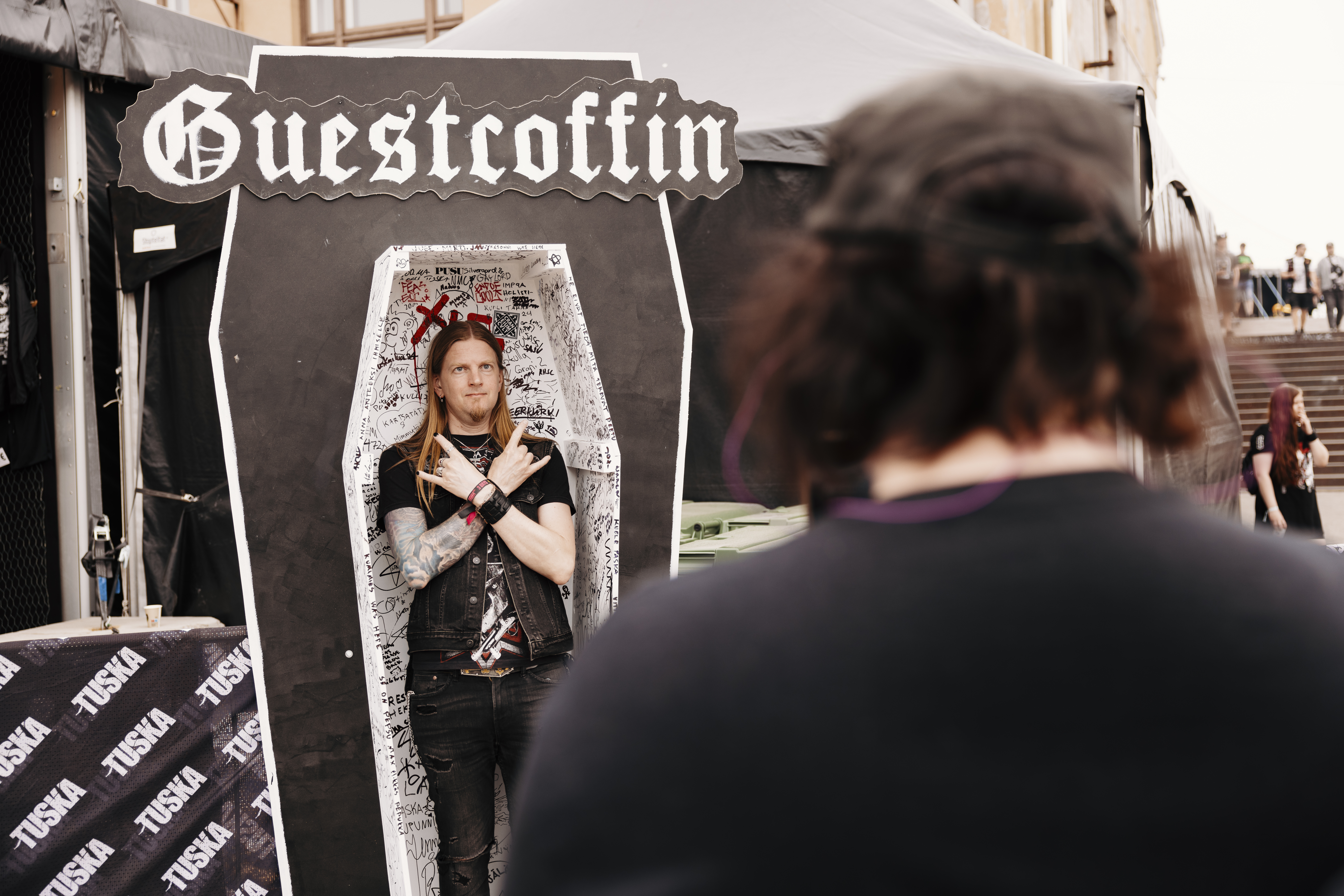 “Odotamme kiinnostavia keskusteluja Tuska-yleisön kanssa heidän toiveistaan. Hautaustoimistohan mahdollistaa kaikki järjestelyt kutsuista kukkatilauksiin ja muistotilaisuuden musiikkivalinnoista hautakiviin. Monet eivät esimerkiksi tiedä, että kirkollisille hautajaisille on erilaisia vaihtoehtoja”, kuvailevat Hautaustoimisto Mikko Mononen Oy:n pisteellä festivaalikävijöitä tapaavat Nicole Nordenswan ja Maria Alho.
