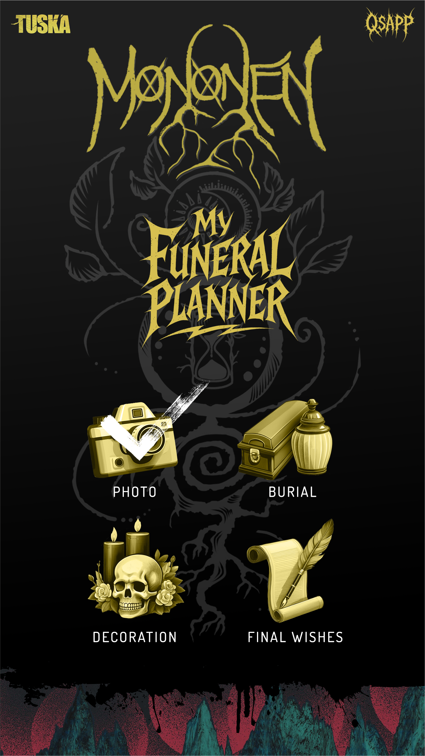 Tuskassa on jo vuosien ajan päästy poseeraamaan taiteilija Ilmari Wärrin arkkuteoksissa, mutta tänä kesänä elämän lähtölaskentaan uppoudutaan vieläkin perusteellisemmin. Festarin tuoksinassa pääsee suunnittelemaan omat hautajaisensa Tuskan uuden yhteistyökumppanin, Hautaustoimisto Mikko Mononen Oy:n pisteellä. Paikan päällä on Monosen edustajia, joiden kanssa pääsee keskustelemaan erilaisista hautaamiseen ja hautajaisiin liittyvistä toiveista ja järjestelyistä uskonnosta ja vakaumuksesta riippumatta. Ennakkosuunnittelu usein helpottaa omaisten suunnittelutaakkaa viikatemiehen vieraillessa.