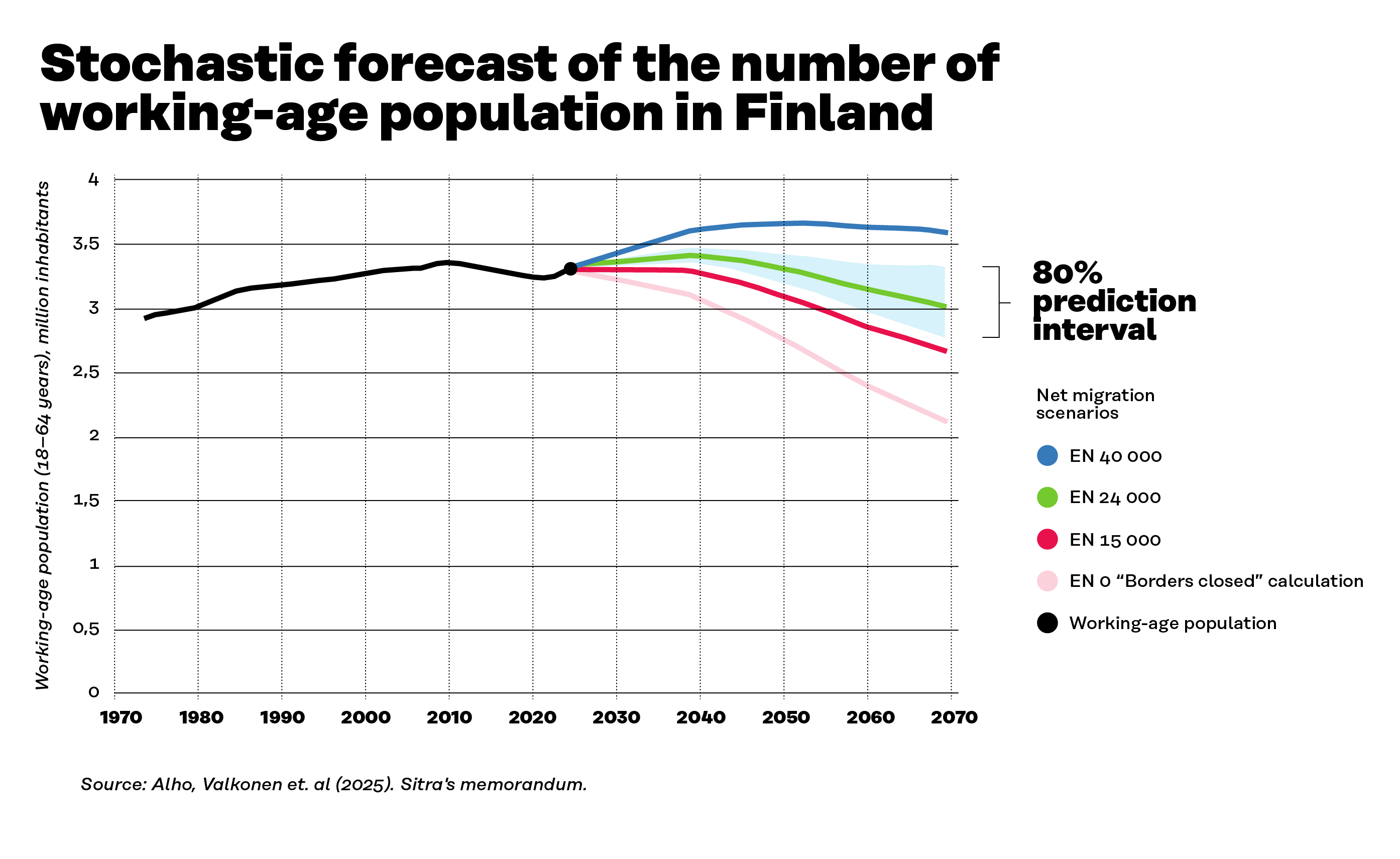 “Population forecasts matter, because many actors are preparing for the future based on them. There are many possible futures, and we can influence them with our decisions. The stochastic population forecast helps outline the range and probabilities of development pathways. Therefore, it is an excellent addition to the discussion on the desired development,” says Sitra’s Paavonen.
