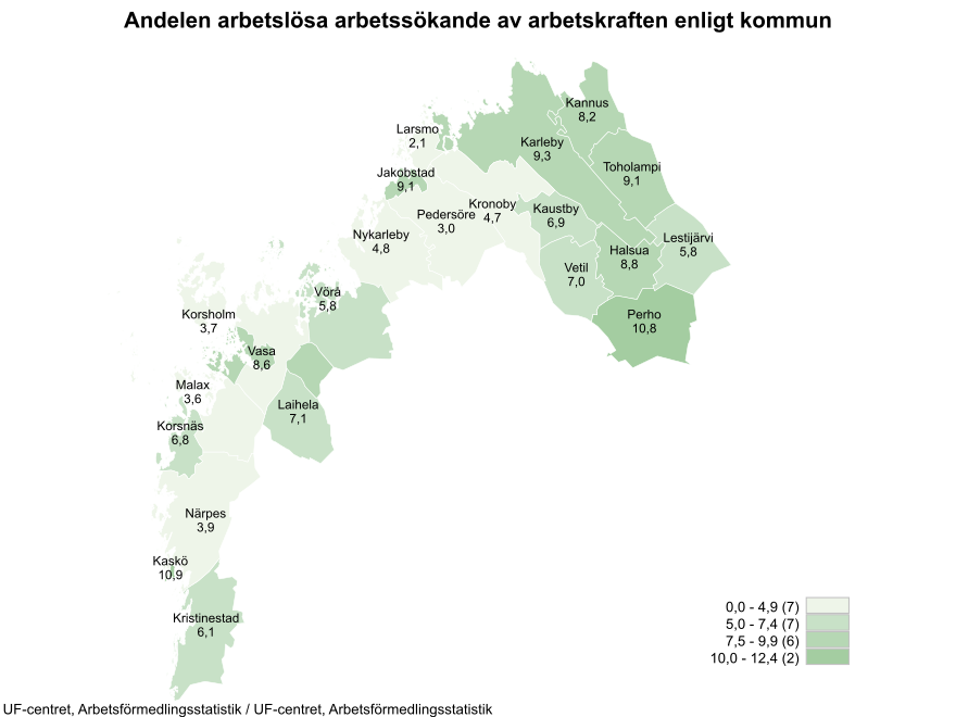 Kommunvis betraktat ökade arbetslösheten mest i Vasa, Karleby och Jakobstad. Andelen arbetslösa arbetssökande av arbetskraften var högst i Kaskö (10,9 %). Andelen arbetslösa arbetssökande av arbetskraften var lägst i Larsmo kommun (2,1 %). Arbetslöshetsgraden i Vasa var 8,6 %, i Jakobstad 9,1 % och i Karleby 9,3 %.