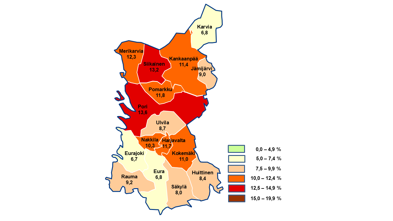 Työttömien työnhakijoiden määrä on noussut vuoden takaiseen verrattuna viidessätoista Satakunnan kuudestatoista kunnasta. Vain Karviassa työttömien määrä on alentunut. Määrällisesti eniten työttömyys on vuoden aikana kasvanut Porissa, jossa lisäystä on ollut 697 henkeä. Suhteellisesti eniten työttömyys on noussut Siikaisissa, 51 prosentilla.