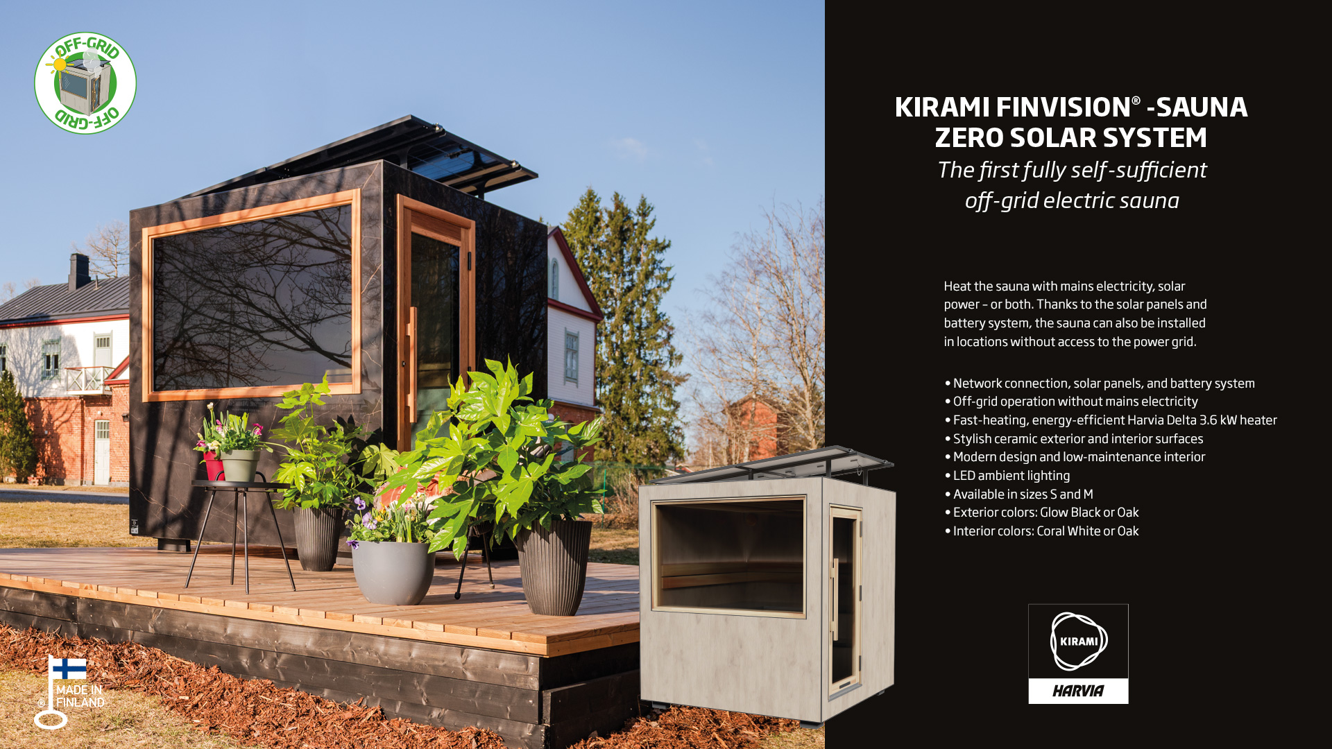 Finnish hot tub and sauna manufacturer Kirami continues to develop its groundbreaking Kirami FinVision® -sauna range. Launched in 2024, the world’s first fully self-sufficient off-grid electric sauna is now available in an improved version with a new name – Zero – and several practical and visual upgrades.