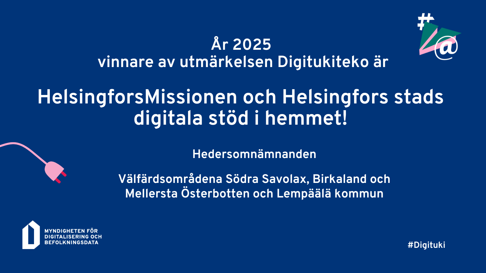 - ENG: Digital support brought to homes by HelsinkiMissio and the City of Helsinki awarded with the 2025 Digitukiteko recognition award – Digital skills and inclusion for seniors through cooperation