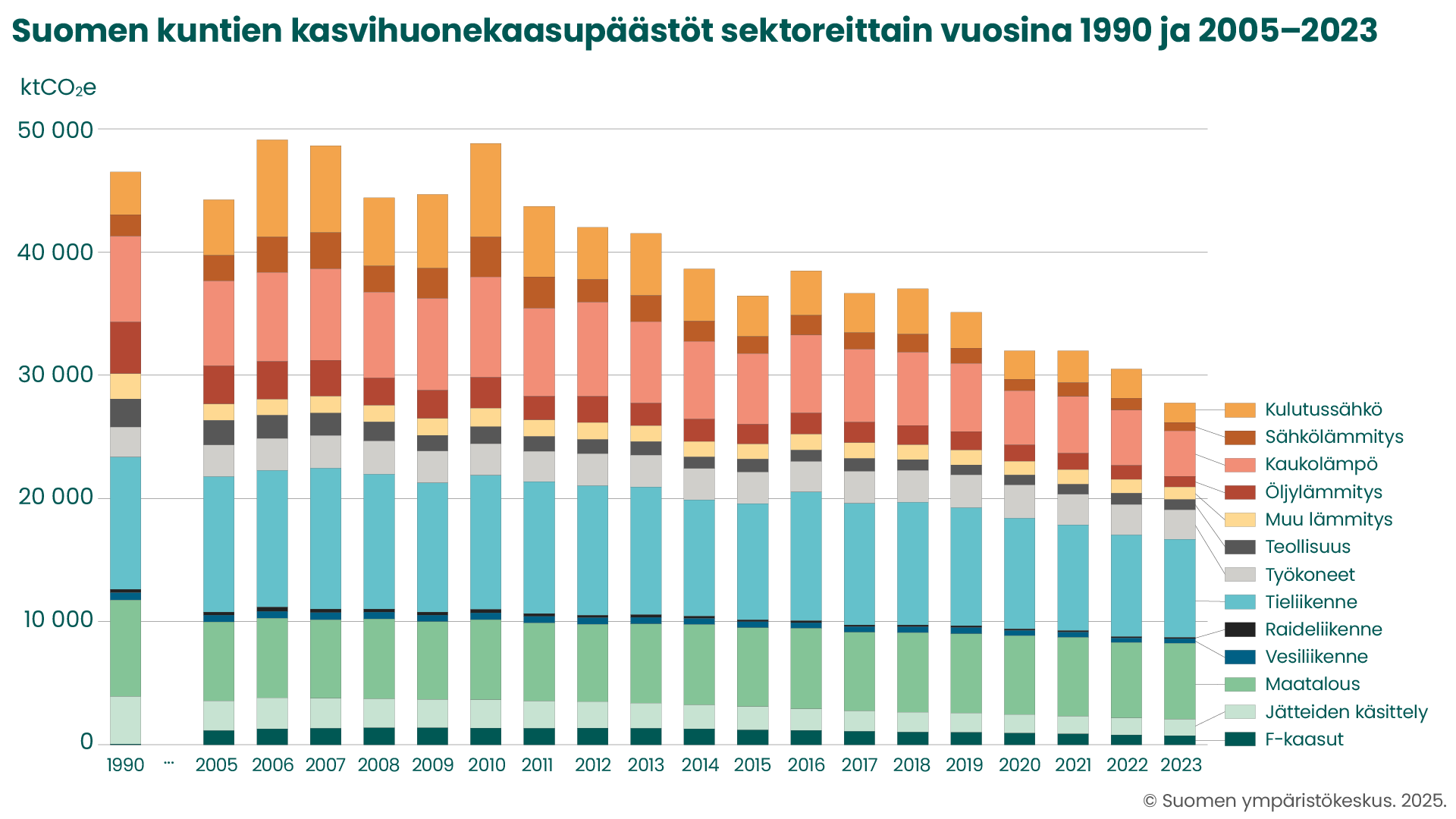Suomen ympäristökeskuksen mukaan kuntien kasvihuonekaasupäästöt ovat laskeneet viime vuonna noin yhdeksän prosenttia vuoteen 2022 verrattuna. Myönteinen kehitys johtuu pääosin energiasektorin eli sähkön- ja kaukolämmöntuotannon puhdistumisesta.