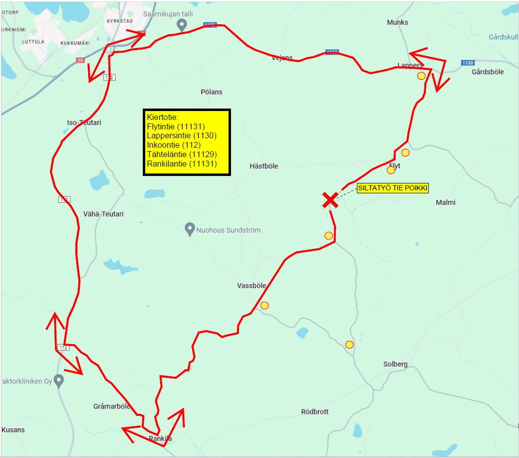 Flytintien (11131) liikenne katkaistaan rakentamisen ajaksi ja liikenne ohjataan kiertotielle Flytintien, Lappersintien, Inkoontien, Tähteläntien ja Rankilantien kautta.