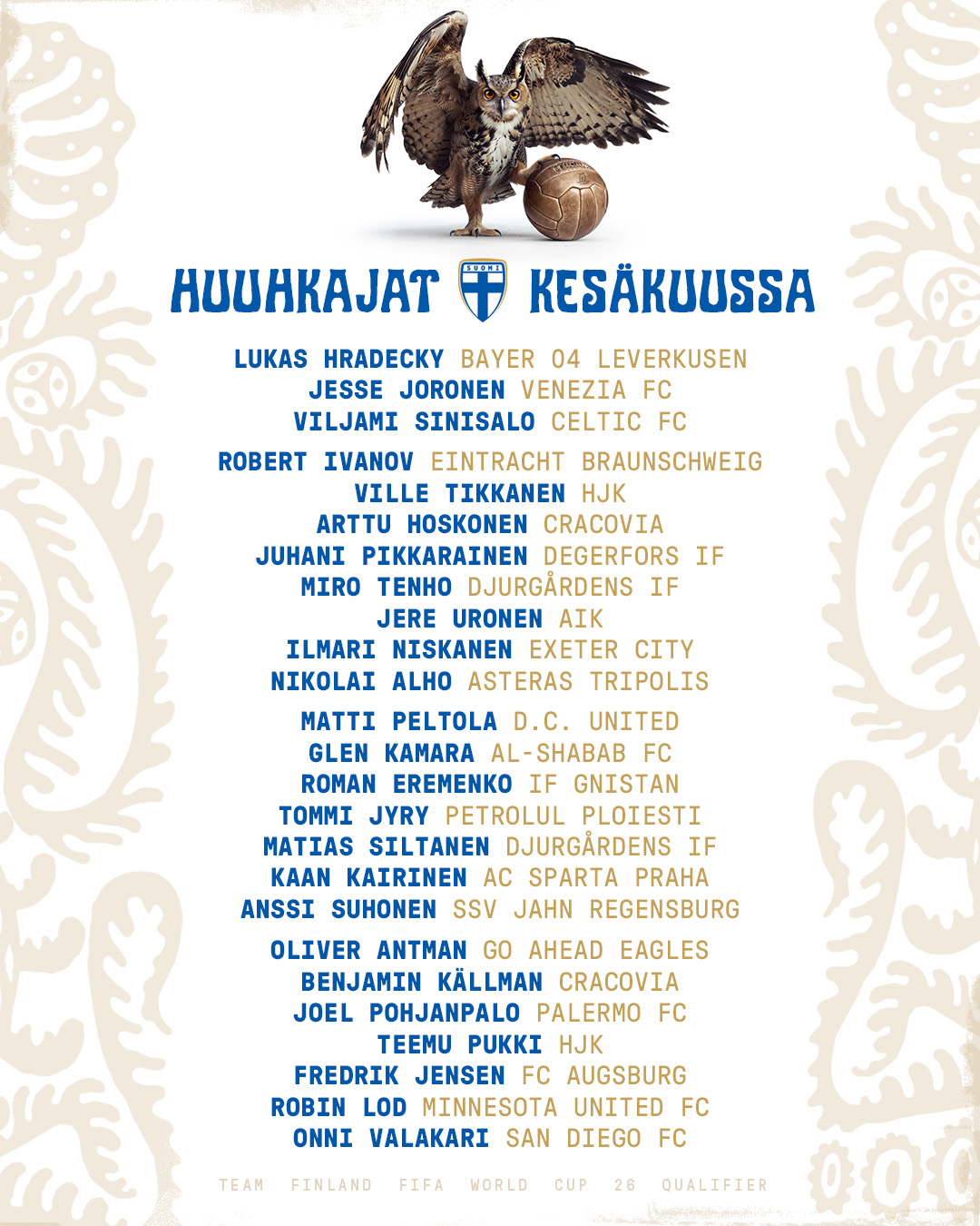 Roman Eremenko palaa maajoukkueeseen lähes yhdeksän vuoden tauon jälkeen. IF Gnistanin keskikenttäpelaaja edusti Huuhkajia edellisen kerran syyskuussa 2016, kun Suomi kohtasi Kosovon MM-karsinnoissa. Eremenko on uusi nimi Friisin ryhmässä, mutta kuuluu Huuhkajien kokeneimpiin – hänellä on tilillään 73 A-maaottelua ja viisi maalia.