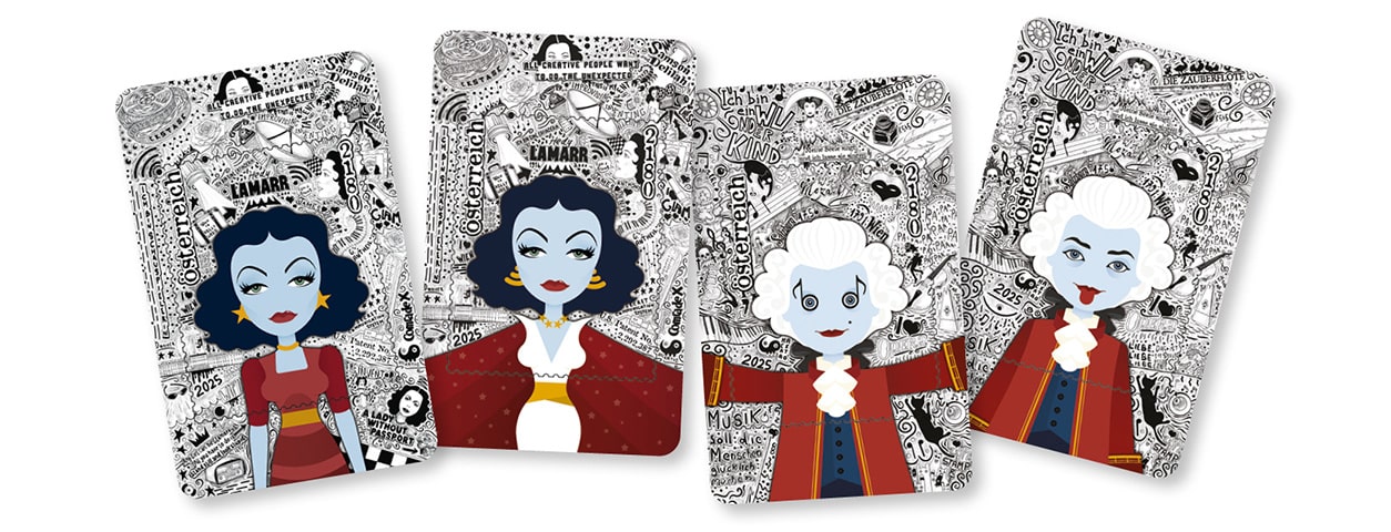 The new Crypto stamp art comes in a total of four different designs: • MOZART, THE MAESTRO - The musical visionary • AMADEUS, THE PRANKSTER - The mischievous spirit behind the genius • LAMARR, THE STAR - The glamorous screen icon • HEDY, THE MIND - The brilliant inventor of modern communication. (Credit: Austrian Post)