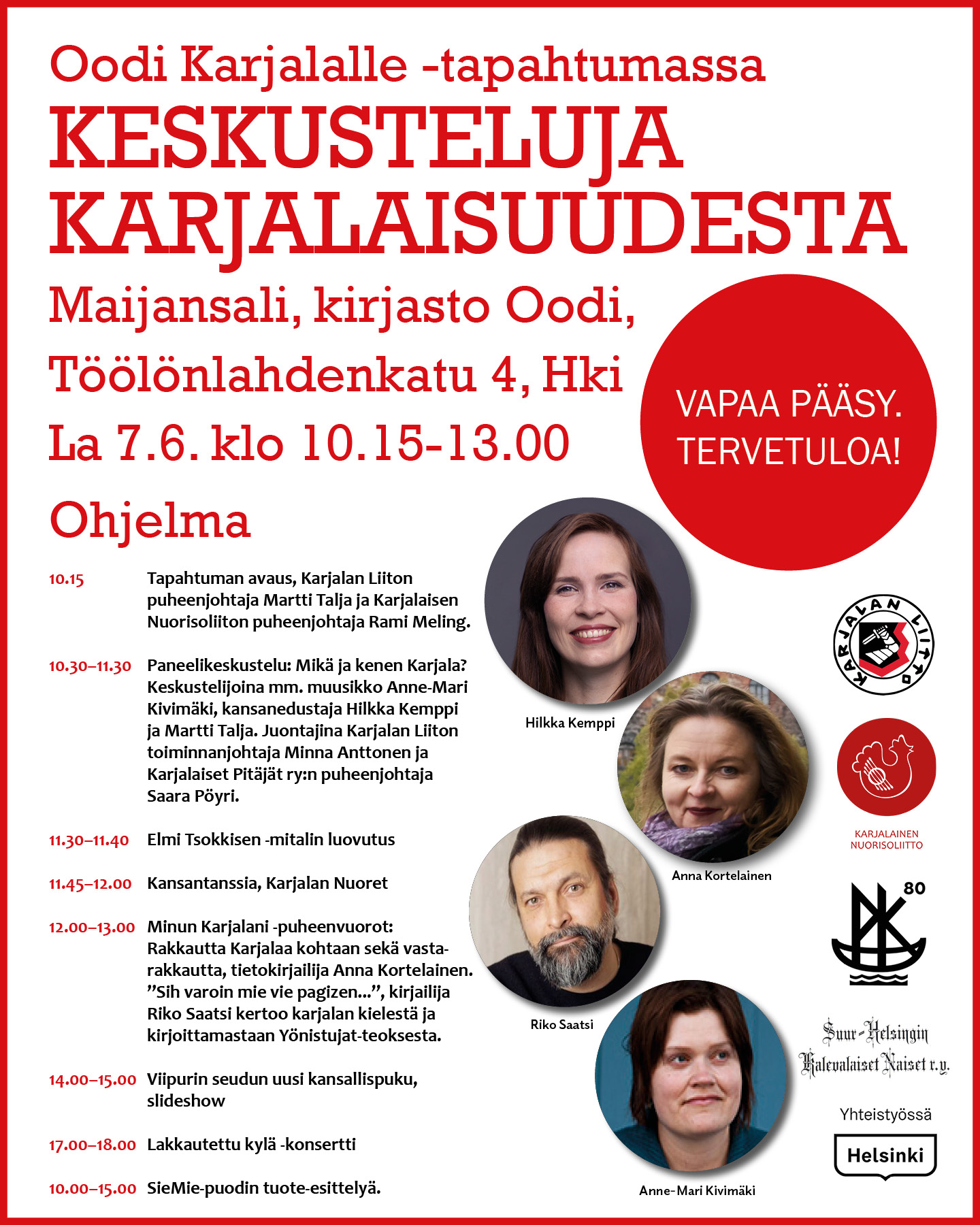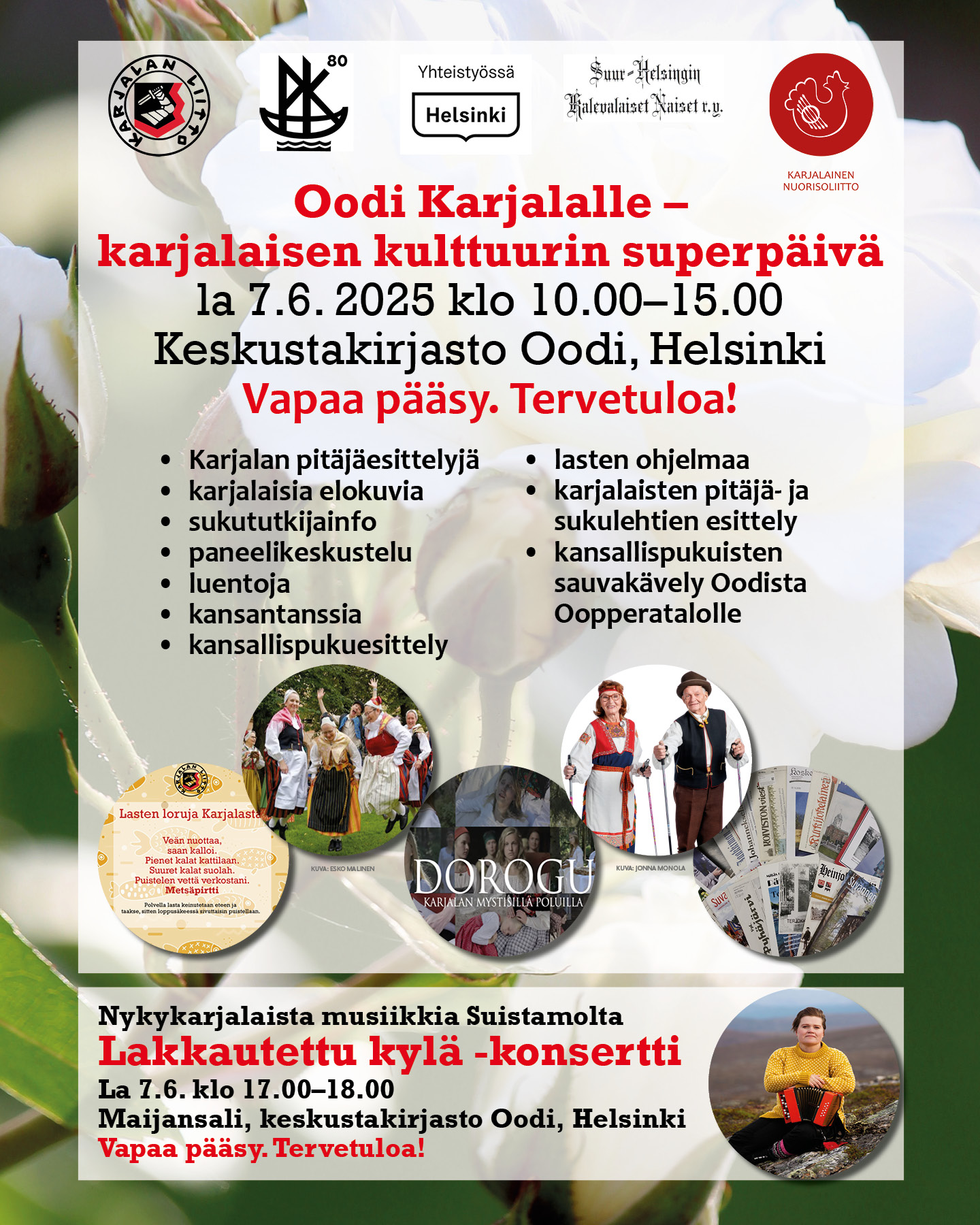 Tervetuloa mukaan hienoon, karjalaiseen tapahtumapäivään! Kaikki tapahtuman osuudet ovat maksuttomia ja ne sopivat myös lapsiperheille! Ohjelmamuutokset mahdollisia.