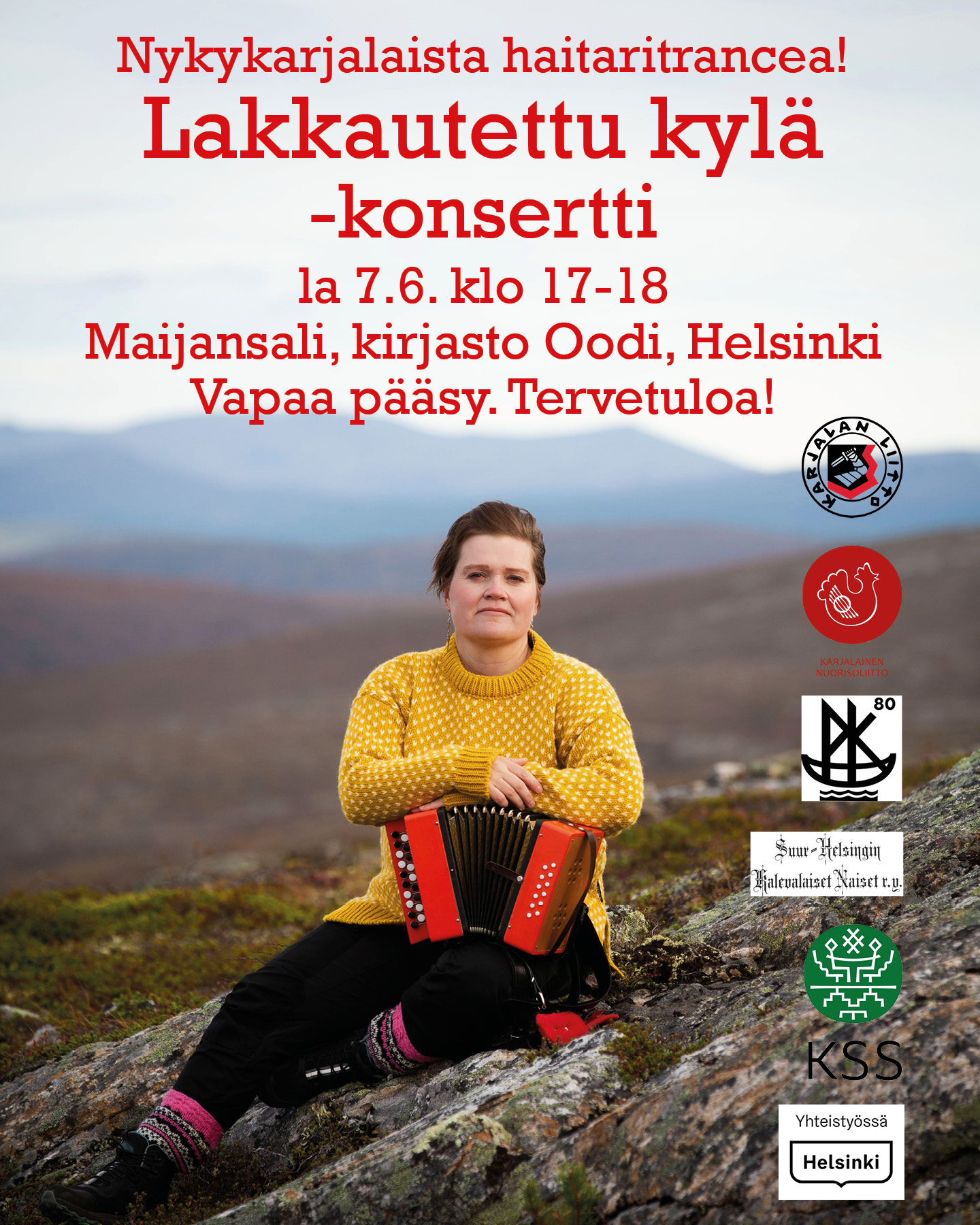 Illalla klo 17.00–18.00 Maijansalissa järjestetään Lakkautettu kylä -konsertti, jossa kuullaan nykykarjalaista haitaritrancea muusikko Anne-Mari Kivimäen esittämänä.