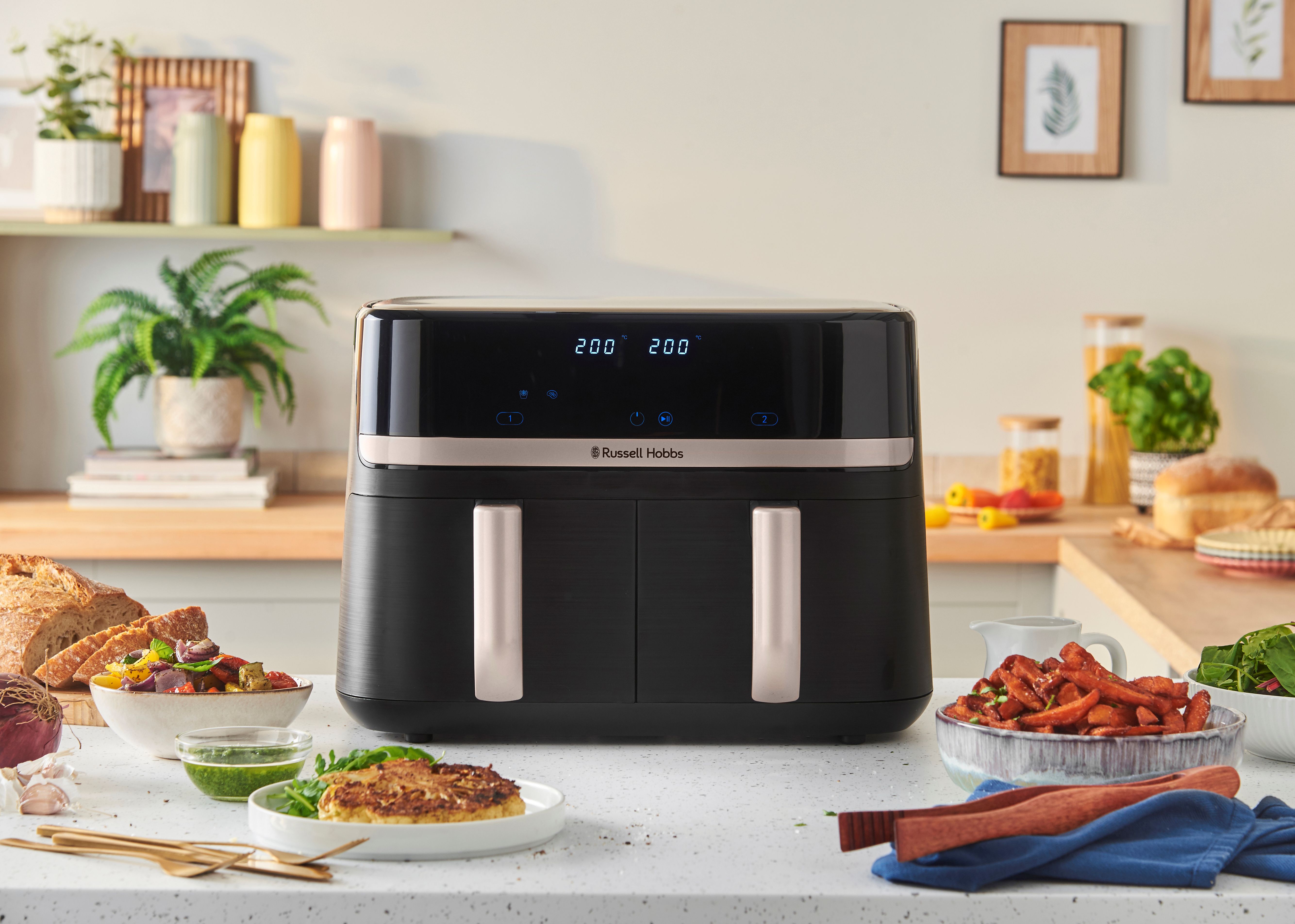 Uuden kaksikorisen Russell Hobbs-ilmafriteerauskeittimen synkronointitoiminto pitää huolta siitä, että koko ateria valmistuu näppärästi samaan aikaan. Kokonaan uudistuneessa tuoteperheessä on kätevät esiohjelmoidut asetukset, joilla voi ruoanlaiton lisäksi muun muassa pitää ruoan lämpimänä ja kuivata raaka-aineita.