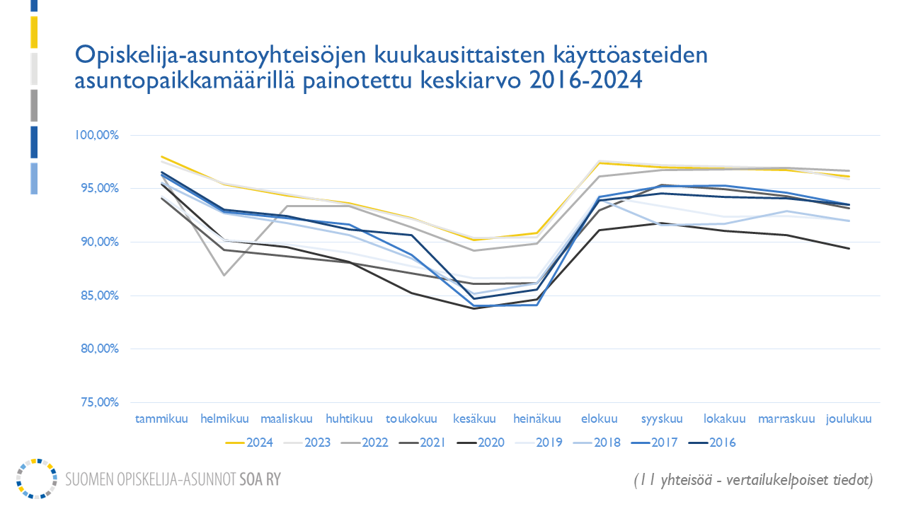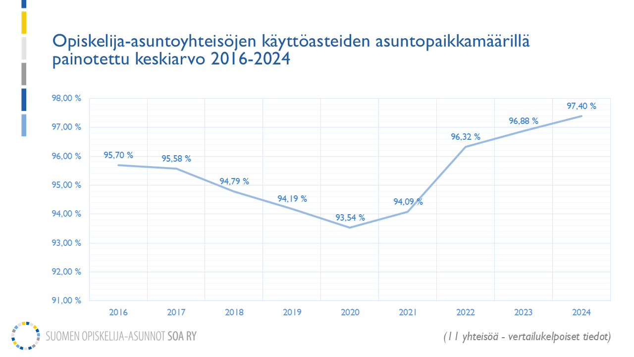 Opiskelija-asuntojen käyttöasteet kipusivat jälleen uudelle ennätystasolle, selviää Suomen opiskelija-asunnot SOA ry:n keräämistä vuotta 2024 koskevista tilastoista. Koko vuoden keskimääräinen käyttöaste oli vuonna 2024 97,4 %, kun sitä edeltävänä vuonna luku oli 96,9%. Vuoden 2024 luku oli korkein vuodesta 2016 alkaneella mittaushistorialla.