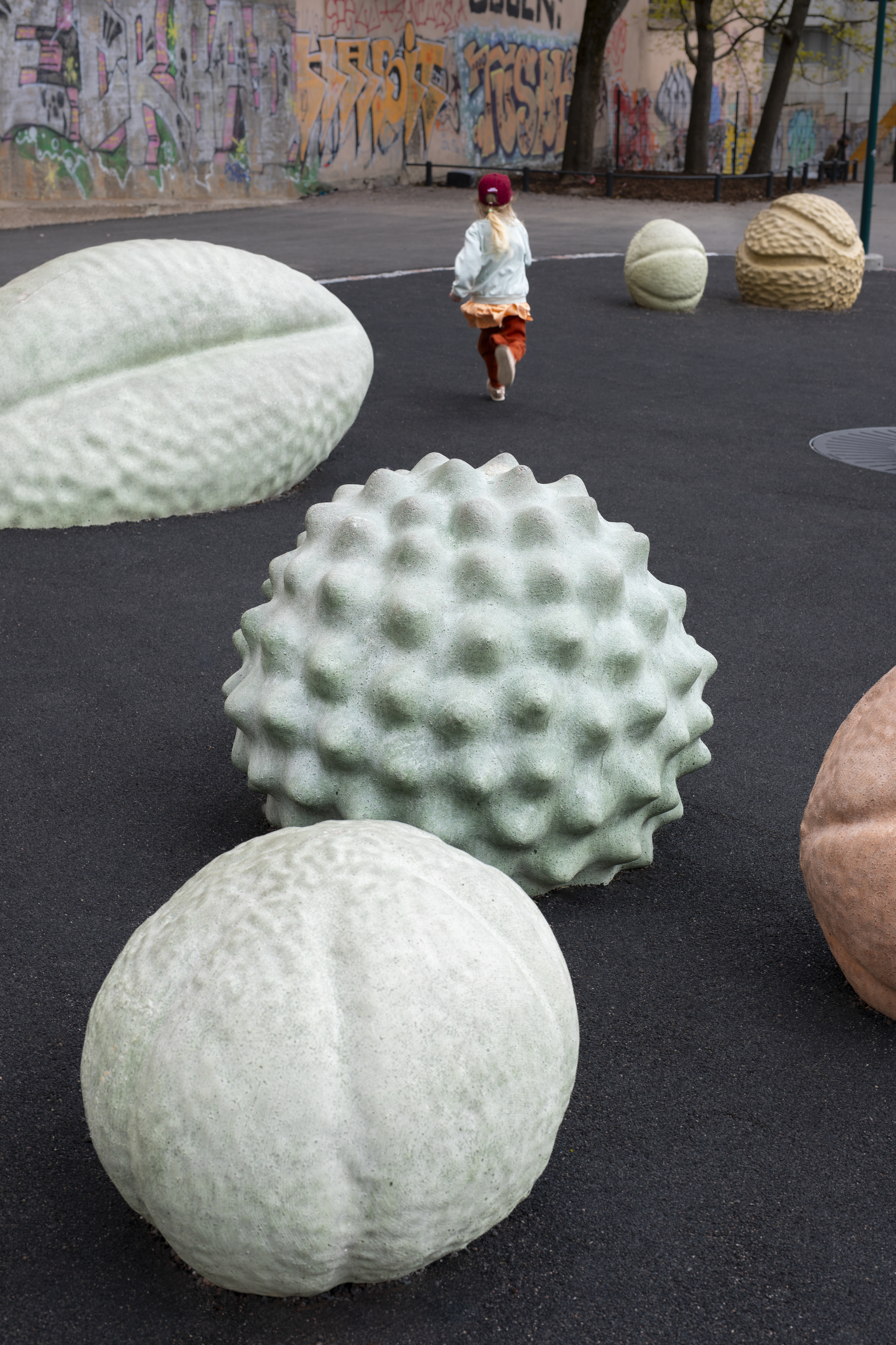 Pihan betoniveistosten muodot perustuvat mikroskoopilla kuvattuihin siitepölyhiukkasiin. Ekström kuvailee, että ” siitepölyä pidetään kasvimaailman timanttina, sen mikroskooppisesta koosta huolimatta se on uskomattoman kestävä.” Koulun omat siitepölytimantit on suunniteltu mahdollistamaan monenlaista leikkiä ja niiden maanläheiset värit saavat inspiraationsa koulurakennuksen perinteisistä värisävyistä. Veistosten ylle kaartuvat kukkavarsia muistuttavat valaisimet.