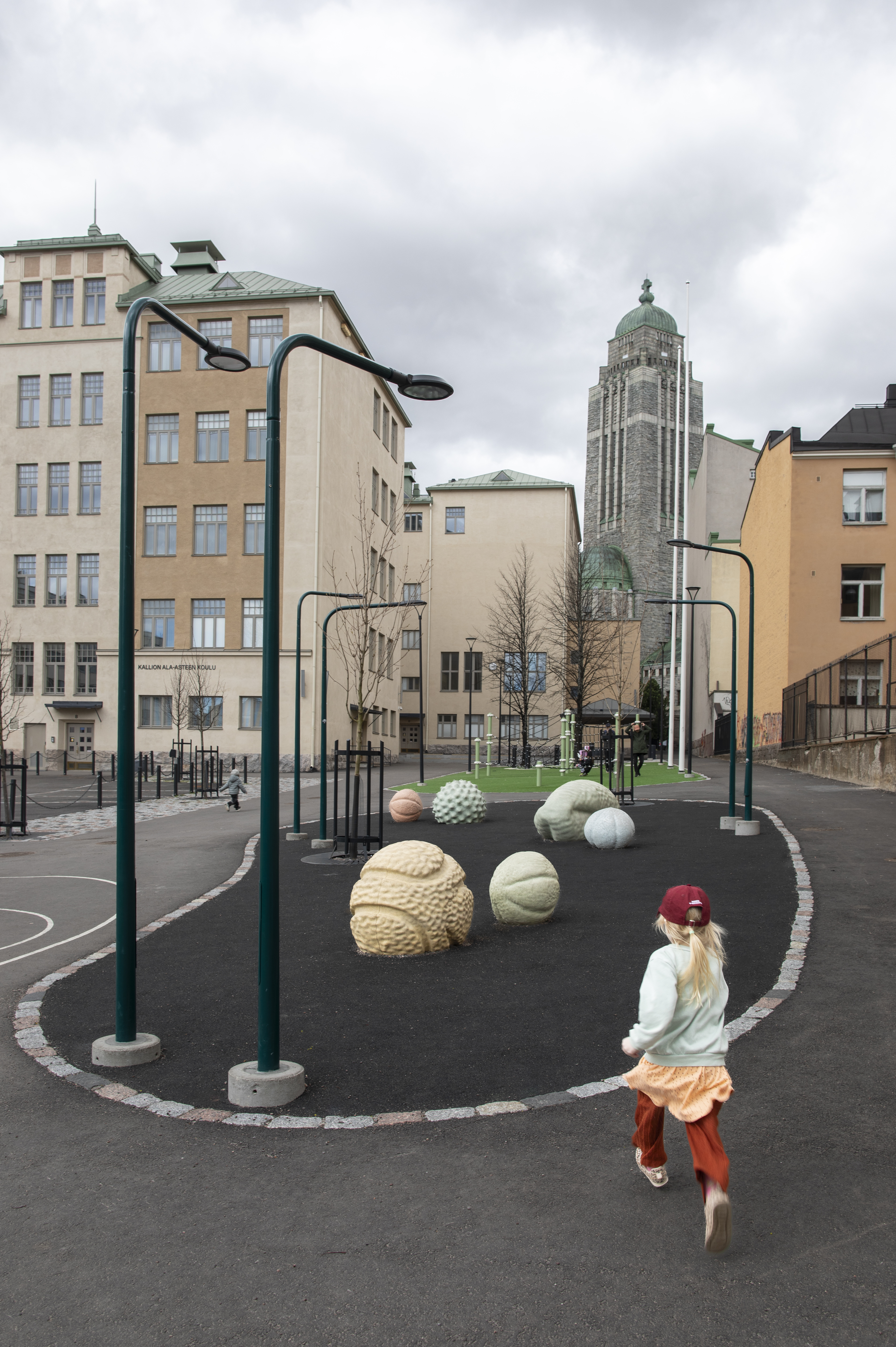 Play and the historical urban milieu of Kallio enter into a dialogue with nature in Saara Ekström’s artwork Pollen. The work consists of a series of concrete sculptures that invite play in the schoolyard, a musical composition that acts as the signal for recess, and an piece indoors that explores forest nature. As part of the artwork, Ekström made a donation to the Finnish Natural Heritage Foundation, which promotes the protection of primary forests. Ekström’s work encourages engagement with the environment and others through joy and curiosity and stands as a reminder of the significance of biodiversity and its essential role to all growth.